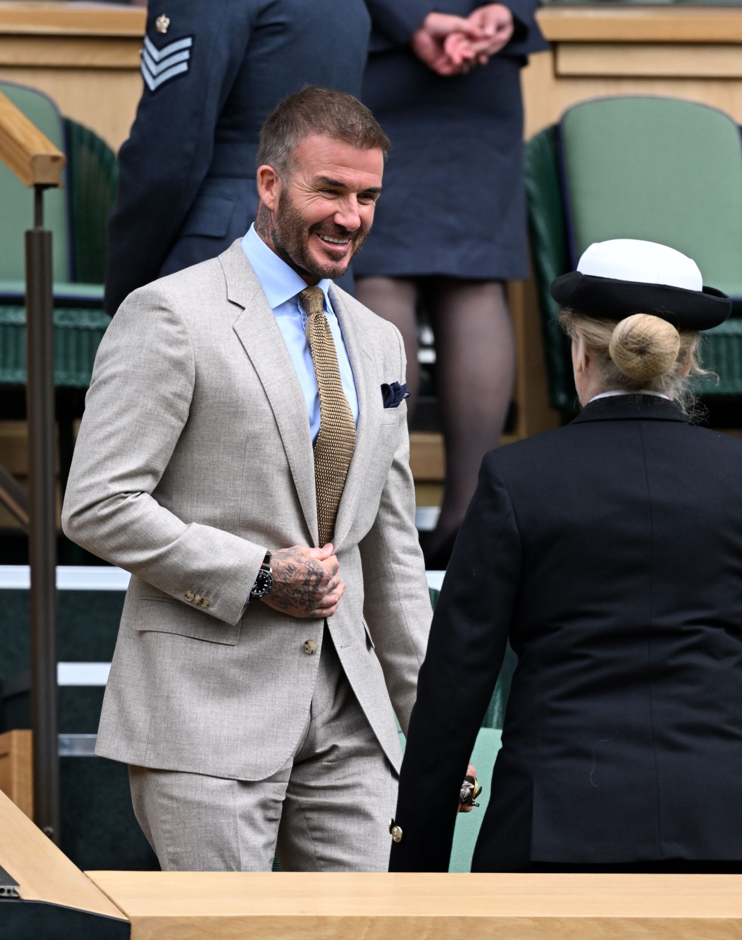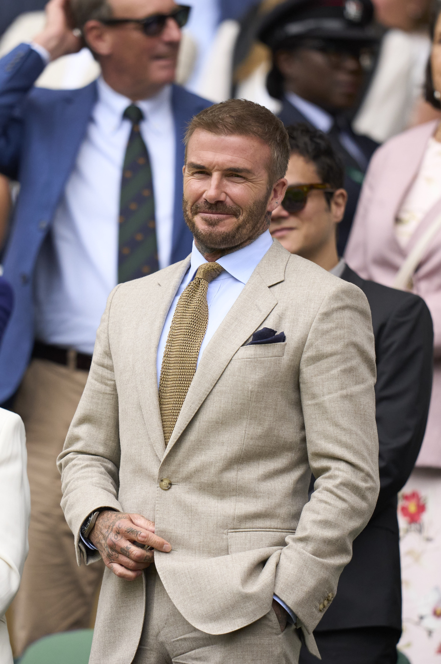 Beckham seurasi tennisturnauksen ensimmäistä päivää beigessä puvussa. Kaulaan hän oli kietaissut astetta tummempaa sävyä olevan solmion. Solmio toi asuun leikkisyyttä, sillä se oli valmistettu neulemateriaalista.