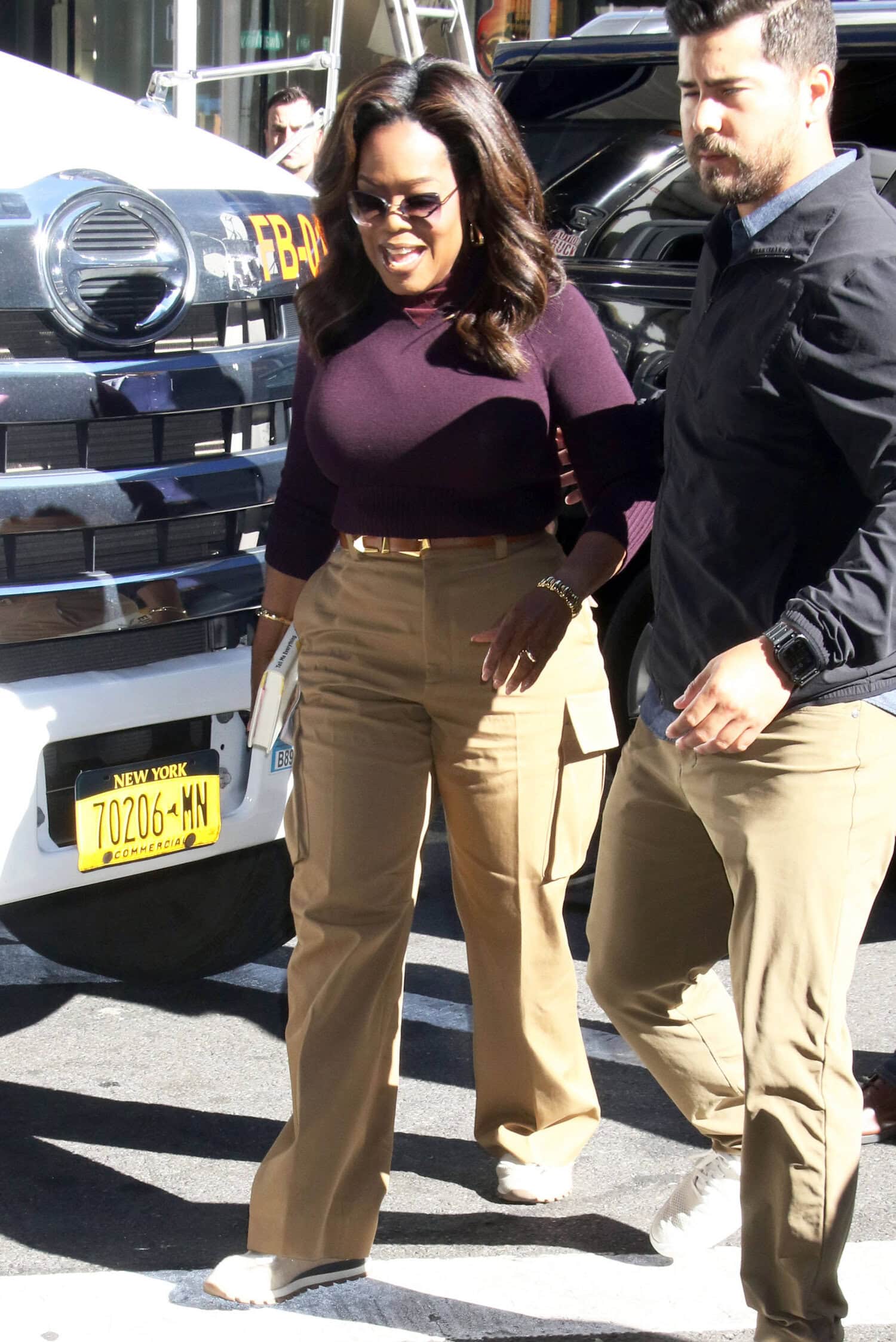 The Oprah Winfrey Show -keskusteluohjelman ansiosta maailmanlaajuisesti tunnetuksi noussut Oprah yhdisti khakinvärisiin cargohousuihin luumunvärisen neuleen, jonka sävy jatkui myös aurinkolasien linsseissä.