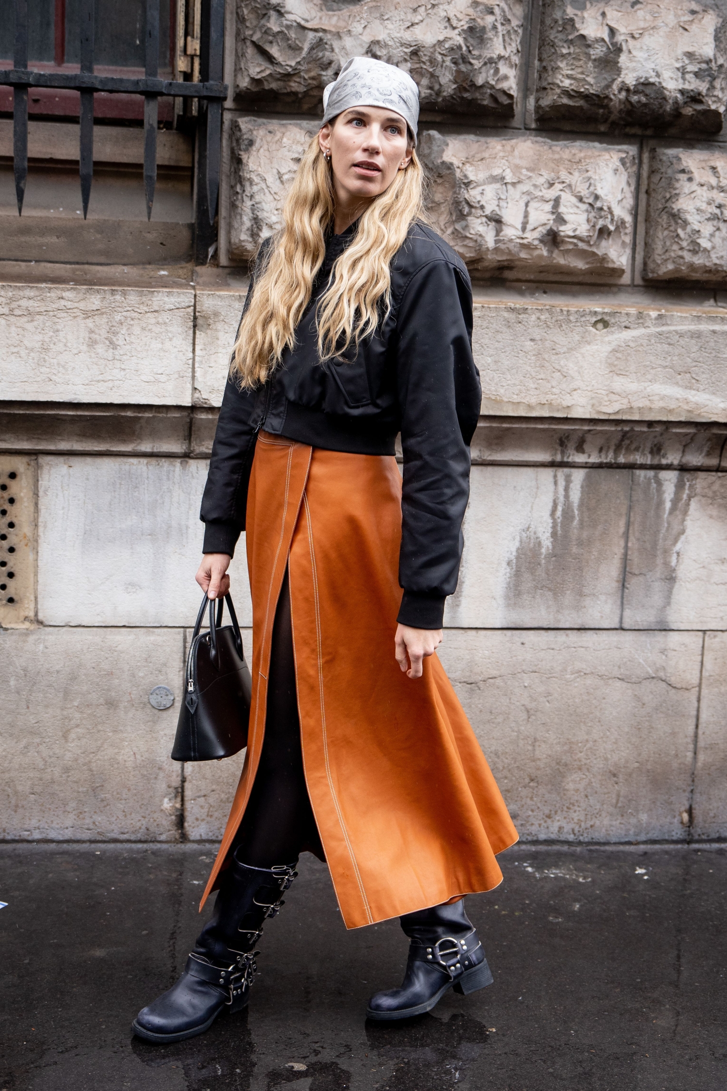Värikäs nahka on nostanut suosiotaan tänä vuonna. Värikkään nahkahameen kaveriksi sopii etenkin musta. Mustat bootsit ja musta yläosa tuovat lookiin ihanaa särmää. Myös huivit ovat trendikkäitä. Sido se päähän ja pelasta samalla huono hiuspäivä.