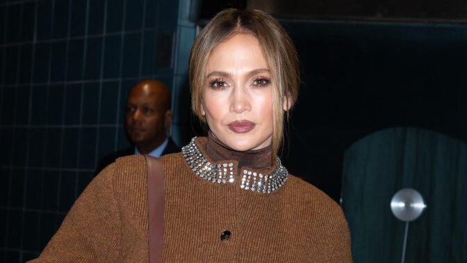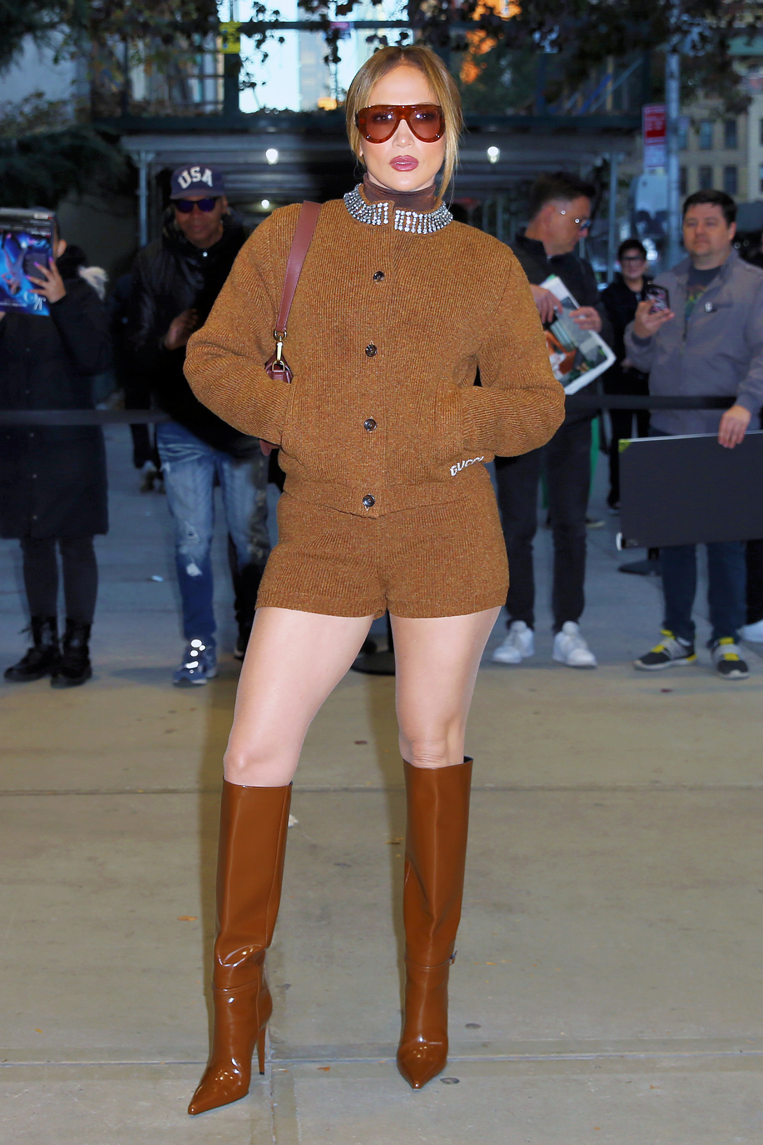 Lopez oli rakentanut kokonaisuuden yhden värin varaan, nimittäin trendikkään ruskean. Samaa väriä nähtiin kautta linjan, mutta hiukan toisistaan poikkeavissa sävyissä. Lopez oli valinnut ylleen ruskeat lyhyet Guccin neuleshortsit sekä niihin istuvan neuletakin, jonka alla nähtiin hieman tummemman ruskea poolopaita.