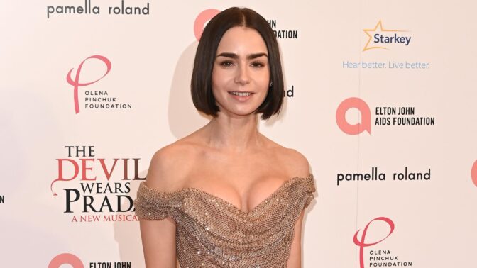 Näyttelijä Lily Collins poseerasi näyttävänä hyväntekeväisyysgaalassa The Devil Wears Prada: The Musical -ensi-illassa. Esityksen tuotto ohjattiin Elton John AIDS Foundationin hyväksi.