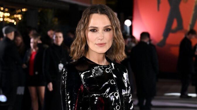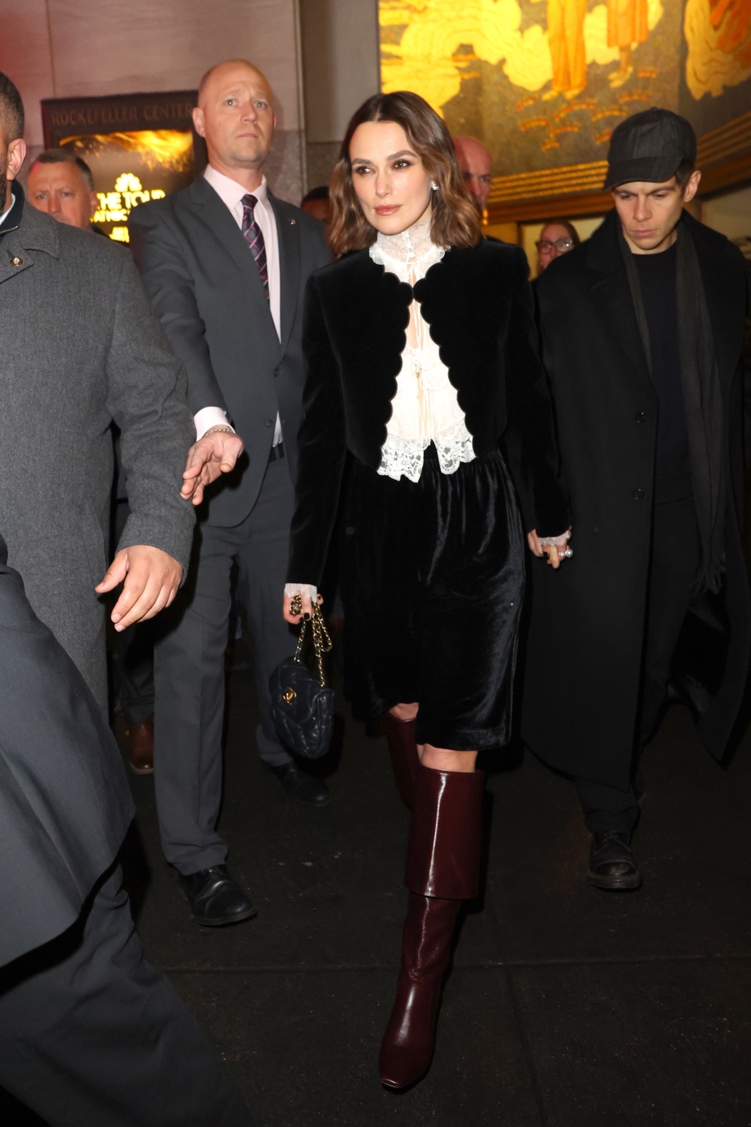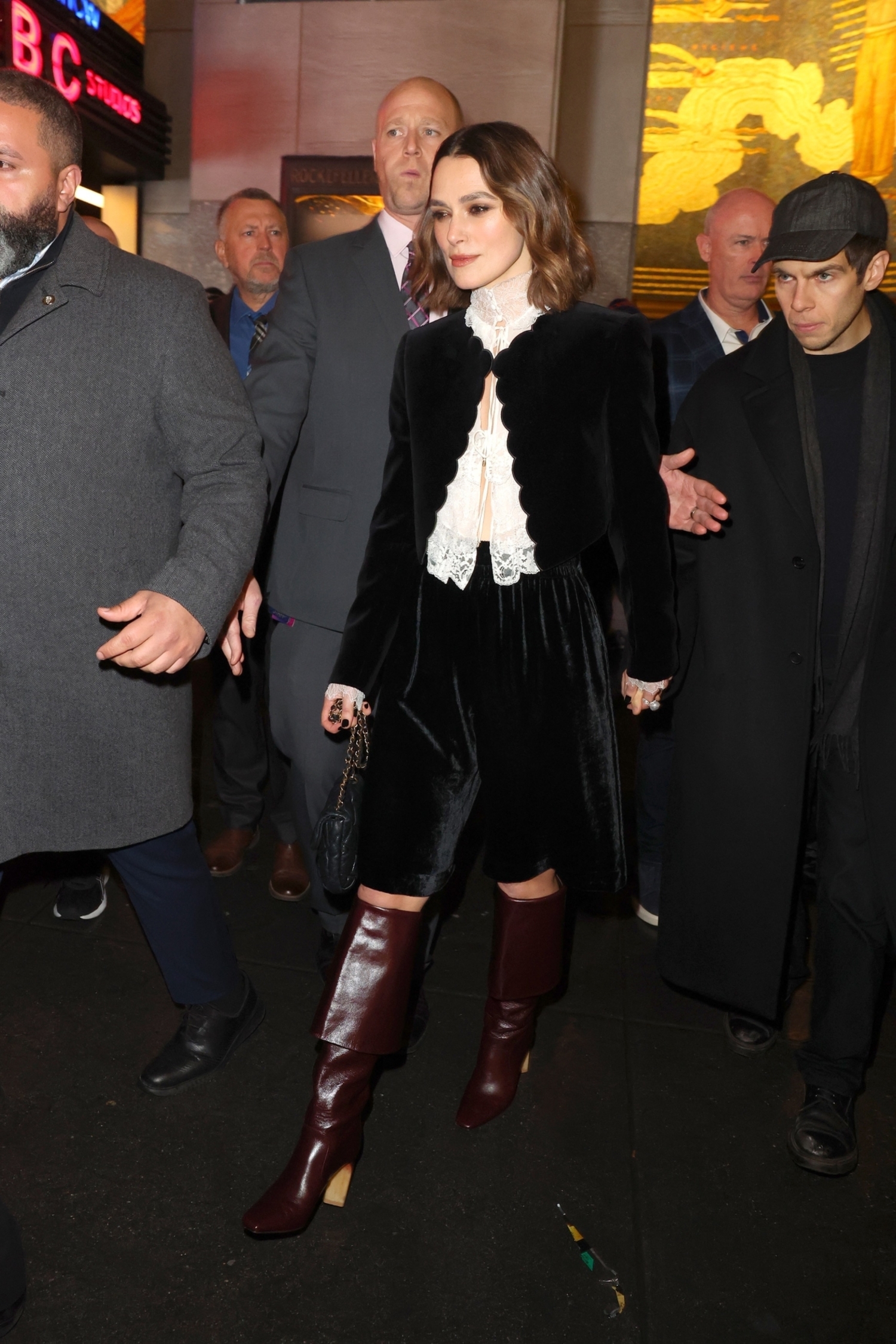 Knightley täydensi tyylinsä polvimittaisilla viininpunaisilla saappailla, jotka toivat kauniin kontrastin muuten mustavalkoiselle asulle.
