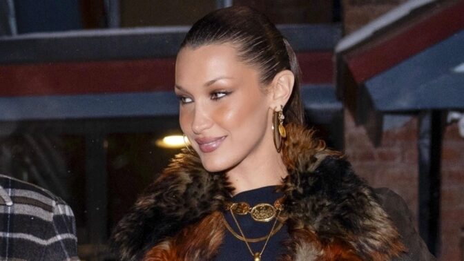 Hadid yhdisti ruskean turkissomisteisen takin mustaan vartalonmyötäiseen minimekkoon. Kokonaisuuden kruunasivat punaruskeat polvisaappaat, jotka toivat asuun vielä lisää kontrastia.