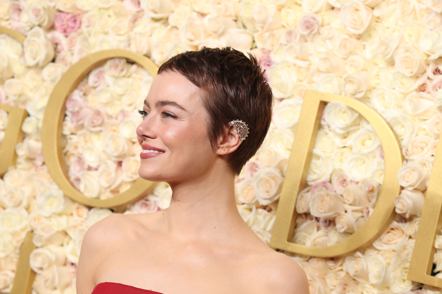 Emma Stone asteli Golden Globe -gaalaan punaisessa olkaimettomassa mekossa – ja yllättävässä lyhyessä pixie-leikkauksessa.