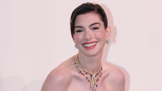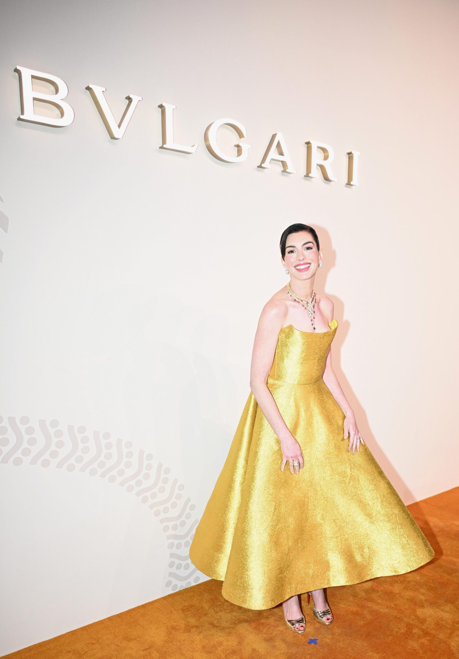 Oscar de la Rentan suunnittelema olkaimeton kultainen juhlapuku oli todellinen katseenvangitsija. Sen nilkkapituinen A-linjainen helma ja salamavalojen alla kimaltava materiaali saivat Hathawayn näyttämään aivan satuprinsessalta.