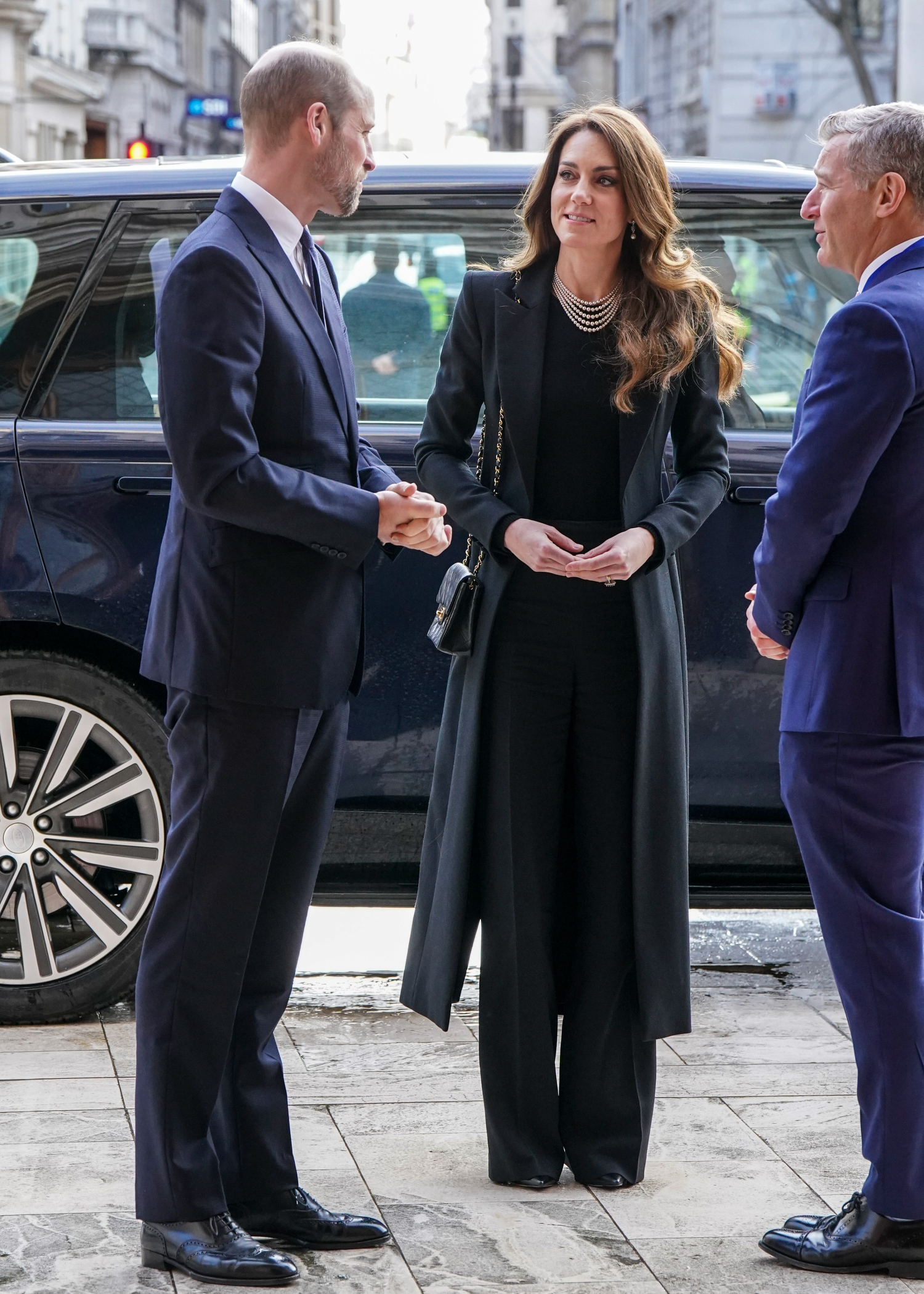 Tilaisuuden laatuun sopivasti prinsessa oli pukeutunut täysin mustaan. Hänen korvakorunsa olivat kuningatar Elisabet II:n kuuluisat Bahrainin timantti- ja helmikorvakorut, joita Kate on käyttänyt monissa tilaisuuksissa vuosien varrella.