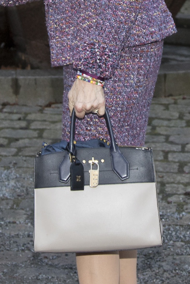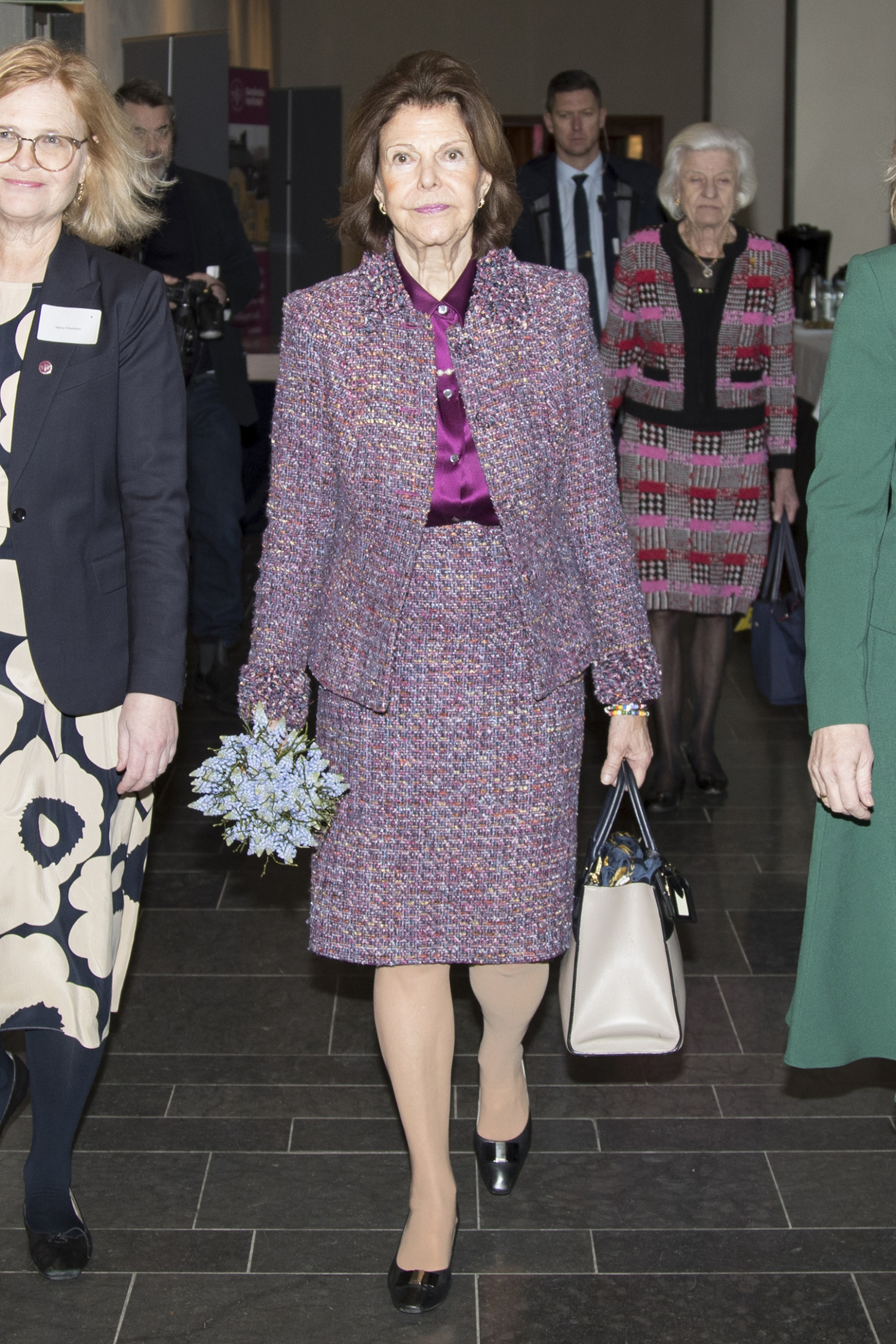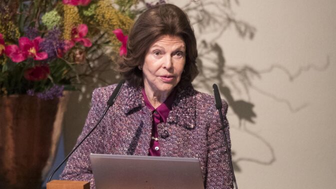 Kuningatar osallistui Tukholmassa Nobel-foorumiin, jossa käsiteltiin dementiatutkimuksen edistystä ja koulutusta. Ylleen kuningatar oli pukenut violetin jakun ja siihen sopivan hameen.