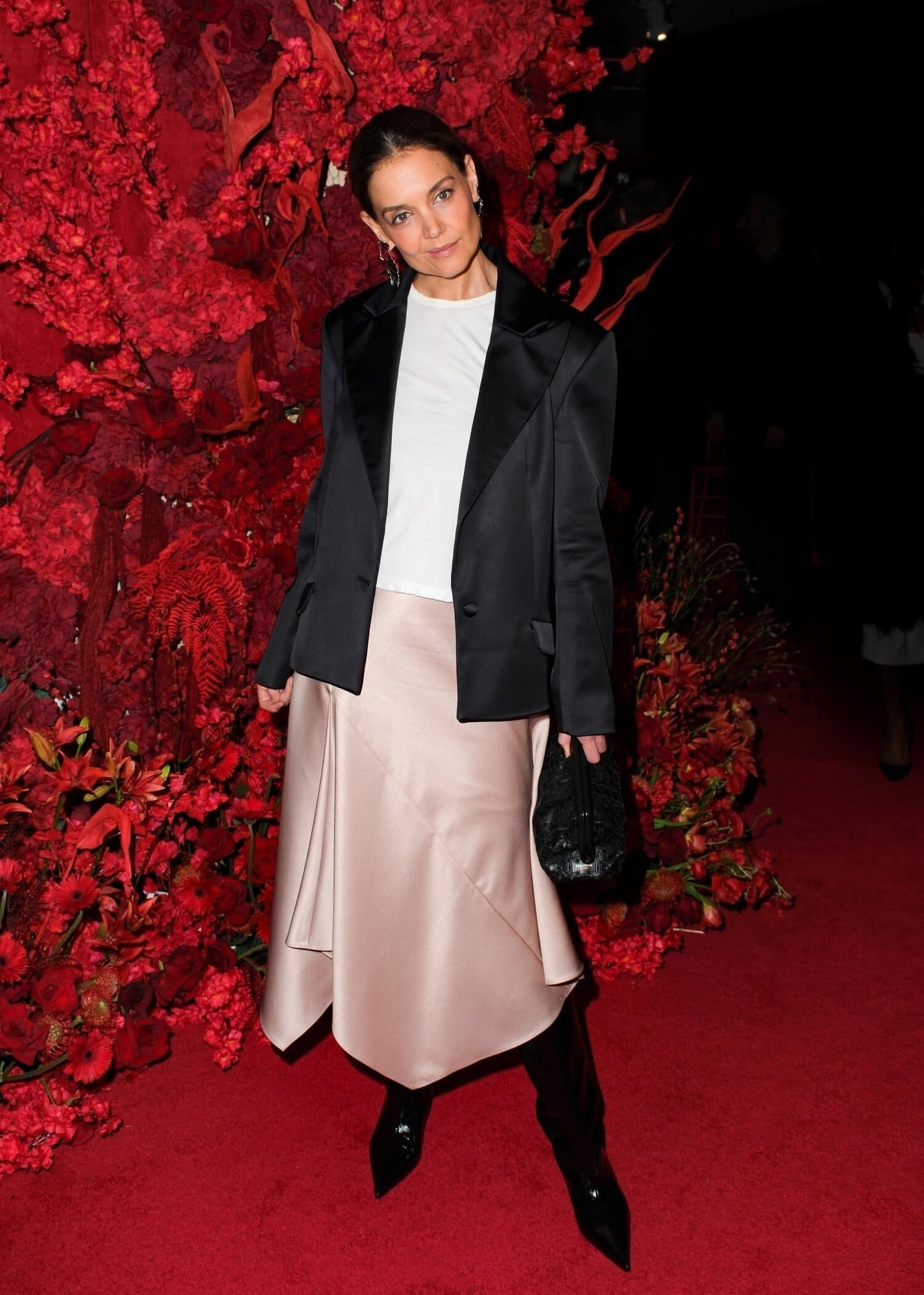 Holmes oli valinnut ylleen valkoisen t-paidan sekä kermanvärisen satiinihameen. Kokonaisuuden hän kruunasi tummansinisellä jakulla sekä mustilla asusteilla.