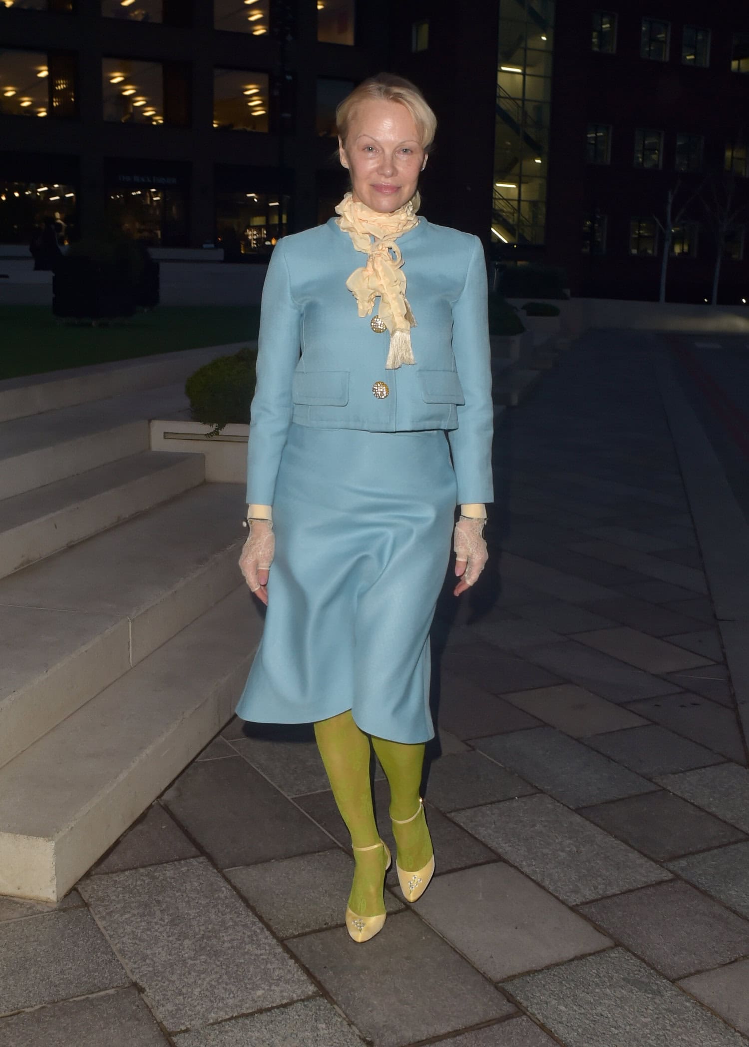 Anderson oli valinnut ylleen vaaleansinisen jakkupuvun, joka koostui istuvasta jakusta sekä polven alapuolelle ulottuvasta hameesta. Sinisen asun kaveriksi Anderson oli valinnut näyttävät vihreät sukkahousut, jotka veivät lookin hetkessä uudelle tasolle.