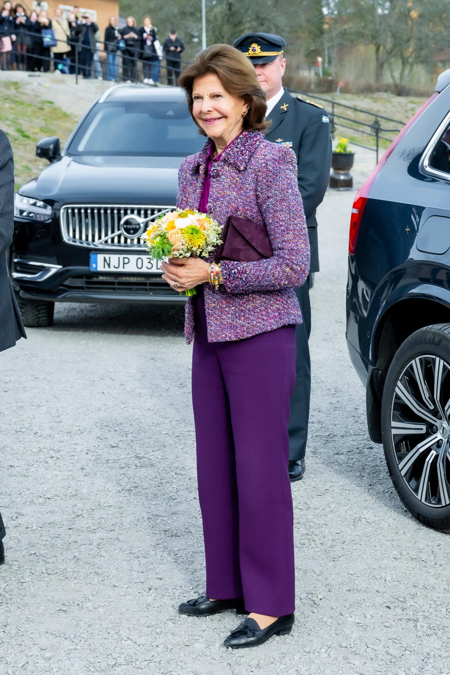 Juhlallisuuksiin ylle kuningatar oli valinnut asun, jossa yhdistyivät hänen usein suosimansa sävyt: syvän violetti, purppura ja viininpunainen. Asusteena oli näyttävä viininpunainen huivi, joka loi hetkessä asuun arvokkaan tunnelman.