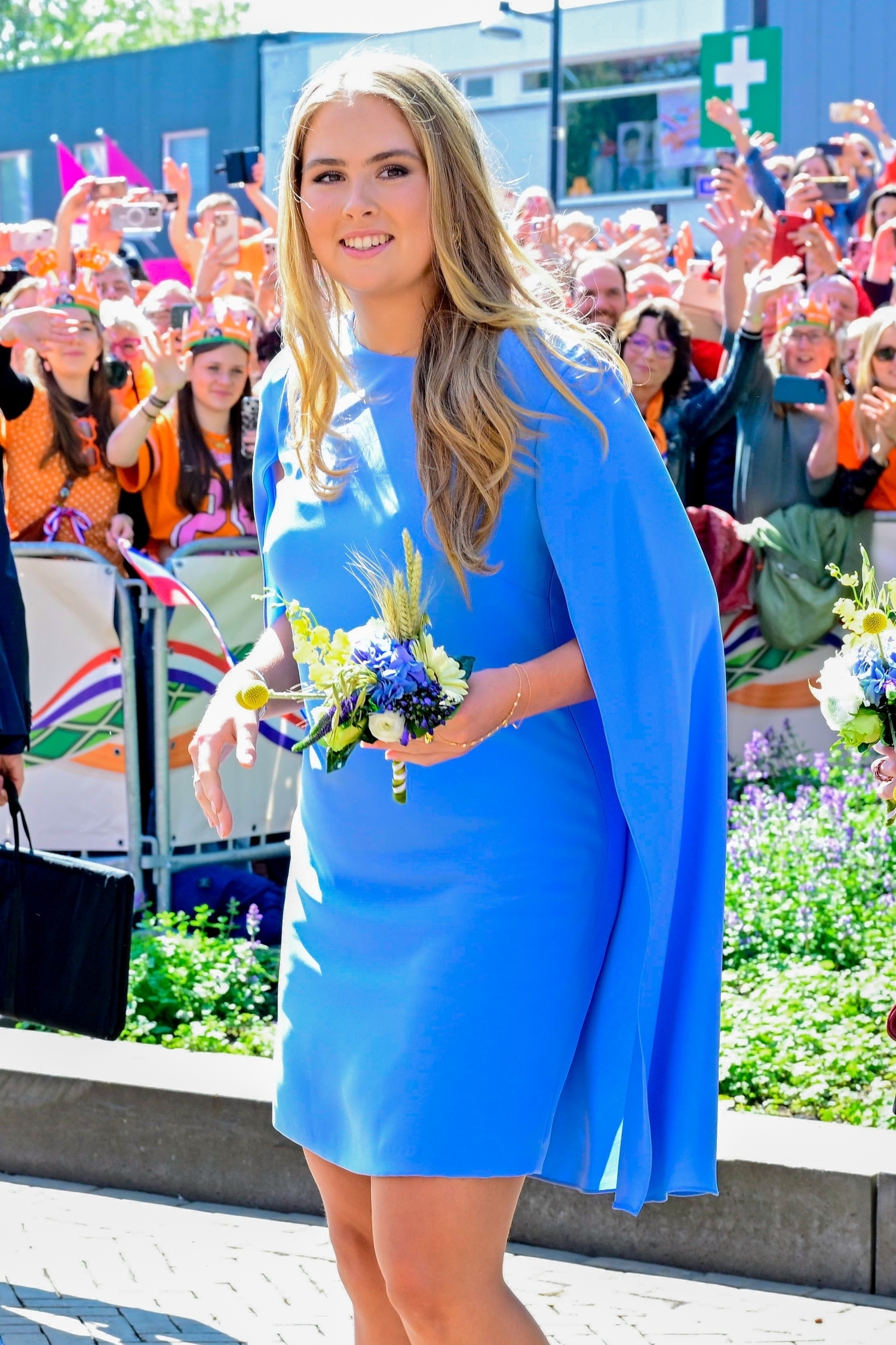 Kruununprinsessa Amalian asu sopii väreiltään keväiseen juhlaan. Hänen mukanaan kantamansa kukkakimppu luo viimeisen silauksen nuoren kuninkaallisen lookille.