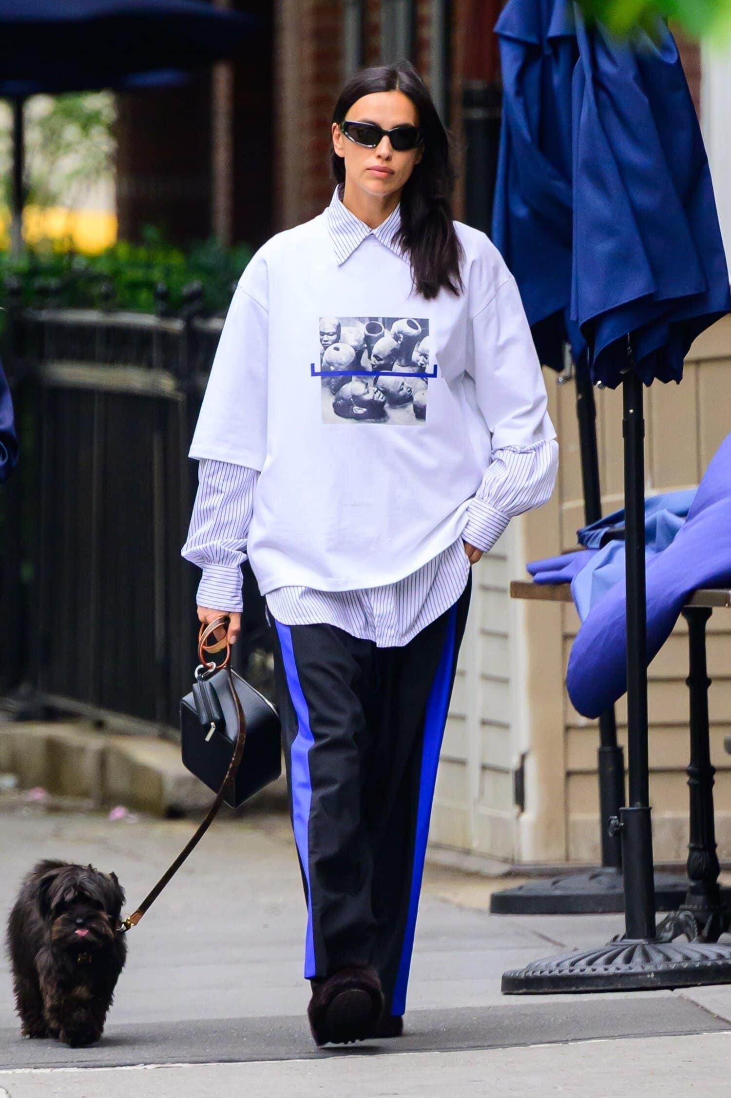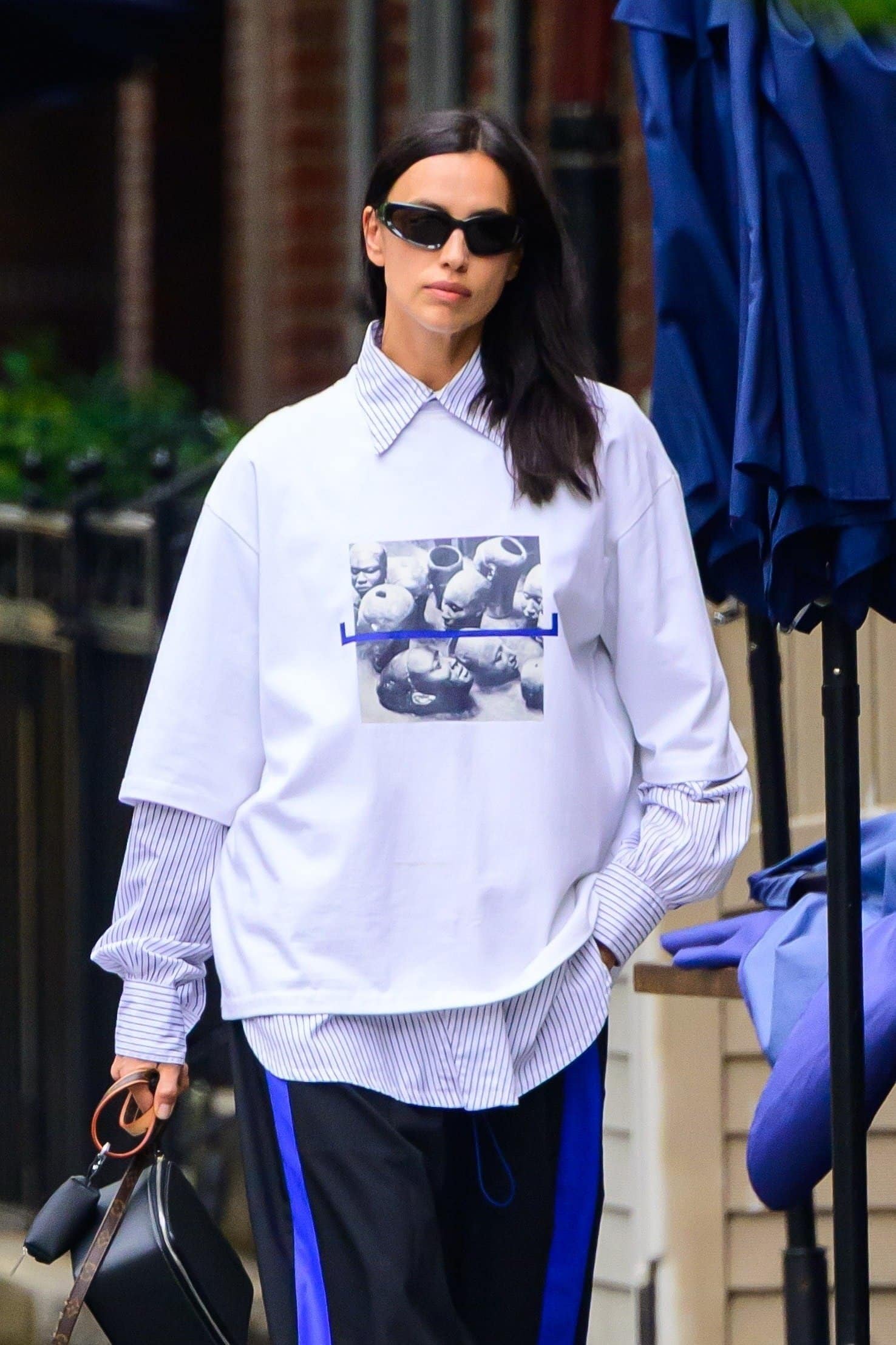 Shayk ikuistettiin kuviin asussa, joka on täysi kymppi. Look koostui rennoista verkkarihousuista, joiden kaveriksi hän oli valinnut raidallisen rennon kauluspaidan sekä ylisuuren t-paidan, joka oli samaa sävyä kauluspaidan kanssa.