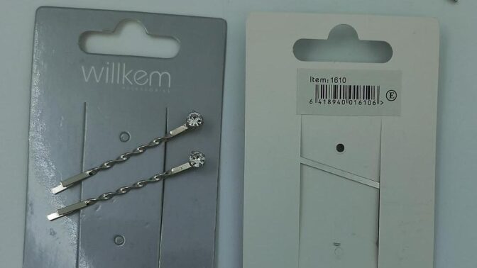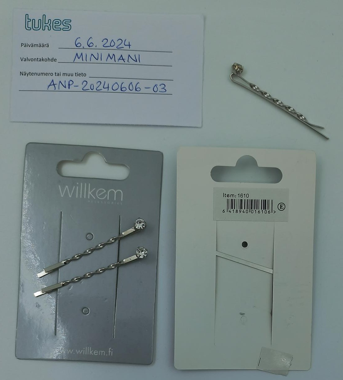Tiedotteen mukaan kyseessä on Willkem-merkin hiuspinnit, jotka myydään kahden kappaleen pakkauksessa. Tuotteissa on strassikoristelu. Kuvan pinnejä on myynyt ainakin Minimani.