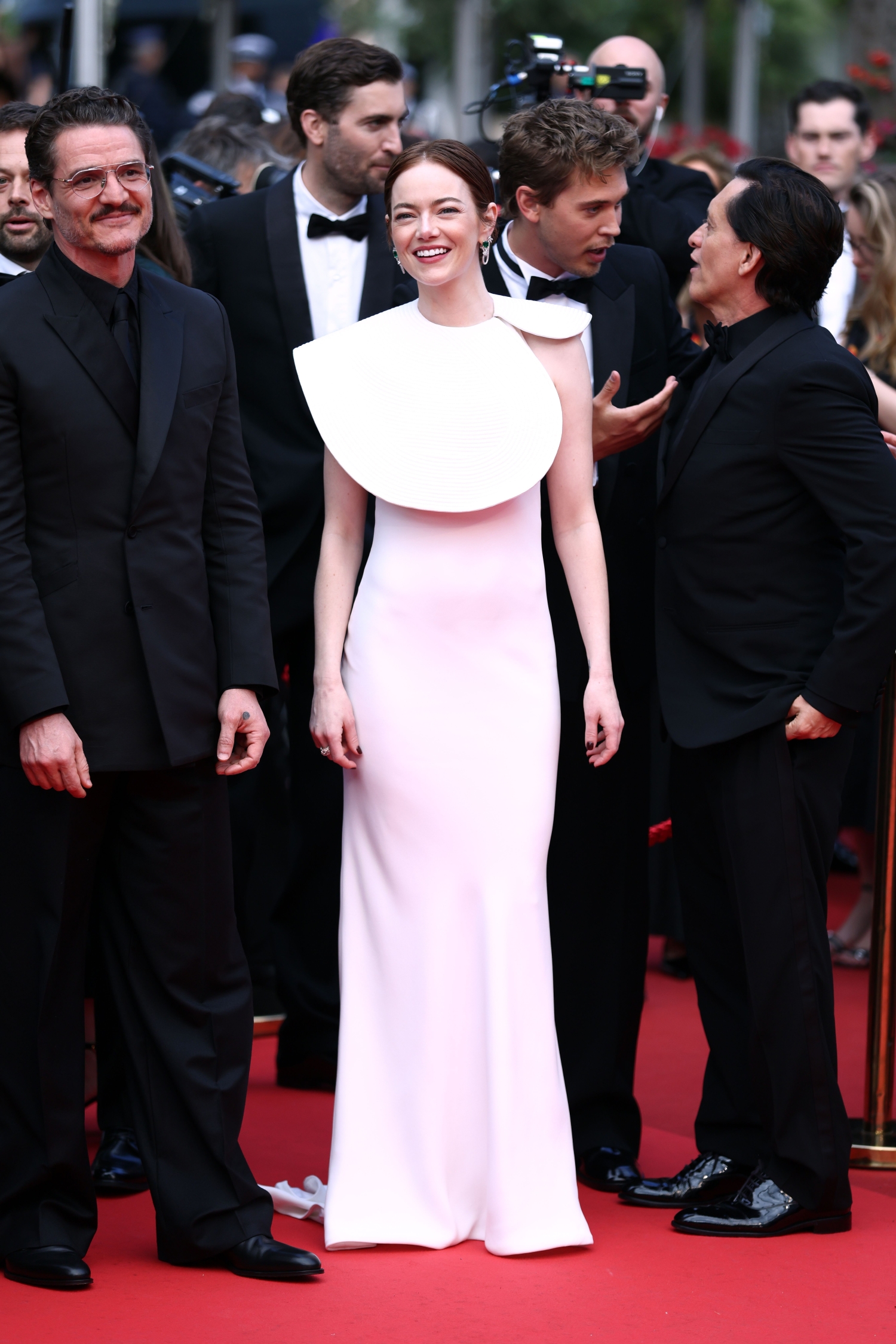 Geometrinen muotoilu näkyi myös Emma Stonen mekon kauluksessa.