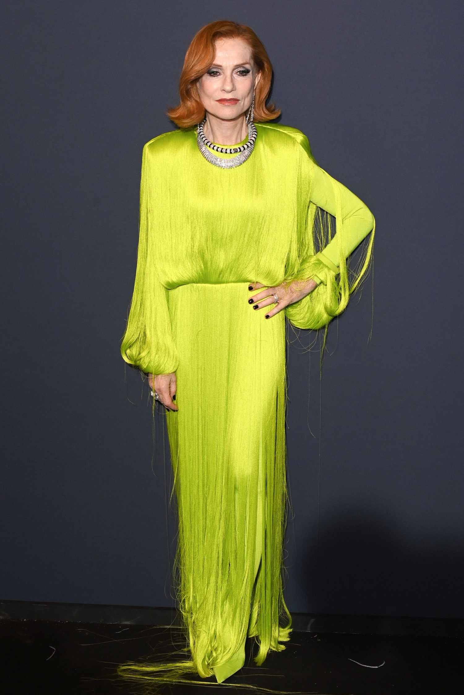 Women in Motion Presidental Dinner -tilaisuuteen saapuneen Isabelle Huppertin mekko oli päällystetty hiusta muistuttavilla säikeillä. Vaatteen väri erottui kirkkaasti muista tilaisuudessa nähdyistä asukokonaisuuksista.