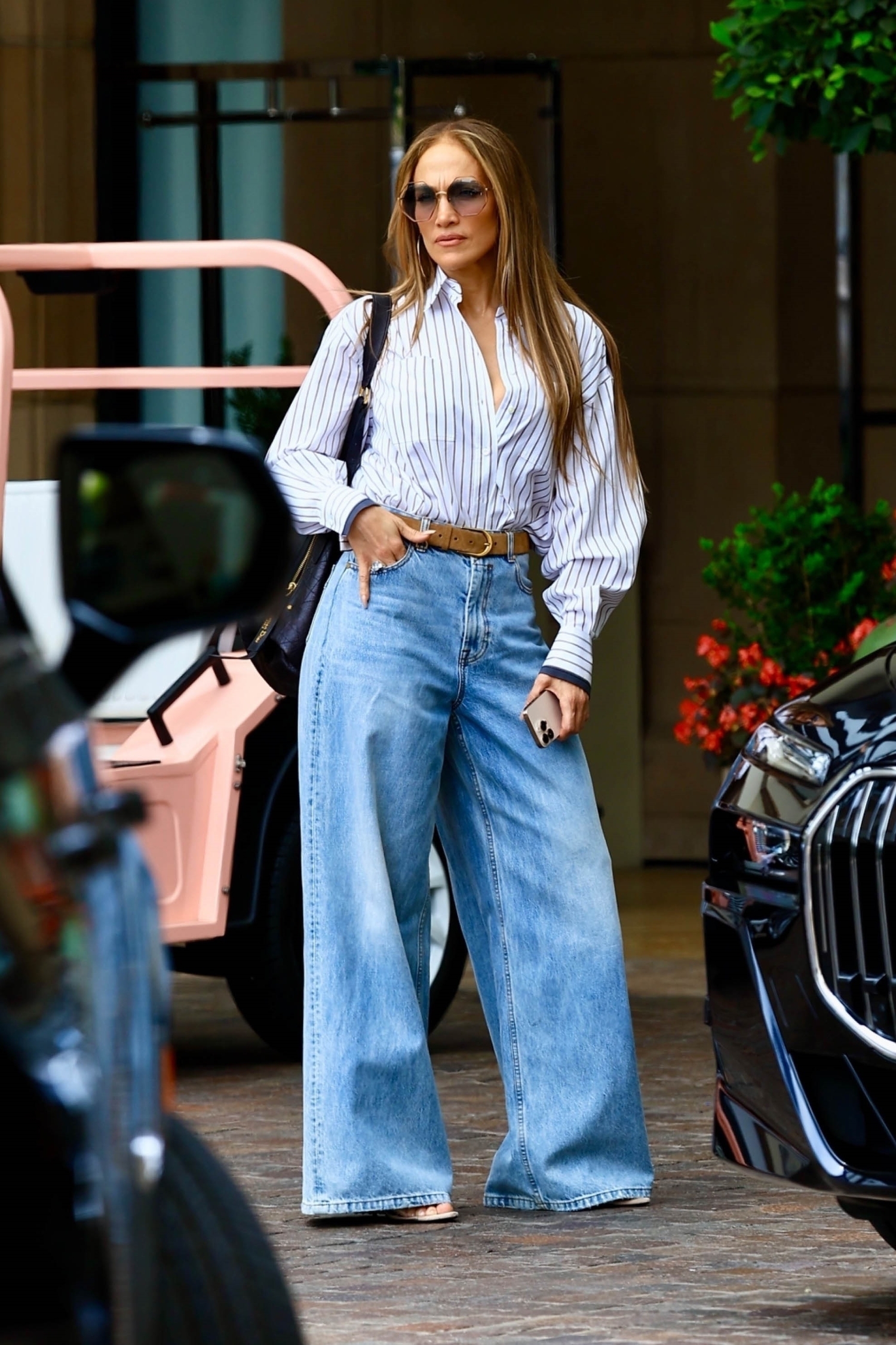Lopez yhdisti asuunsa väljät vaaleat farkut sekä raidallisen rennon kauluspaidan. Paita oli sujautettu housujen sisään, jolloin näyttävä ruskea vyö pääsi oikeuksiinsa.
