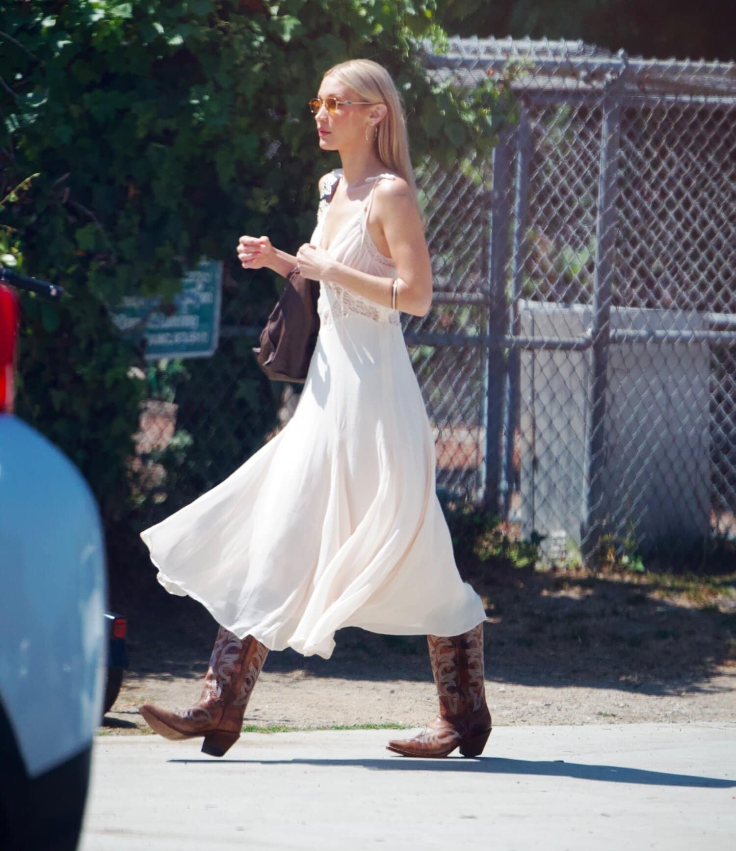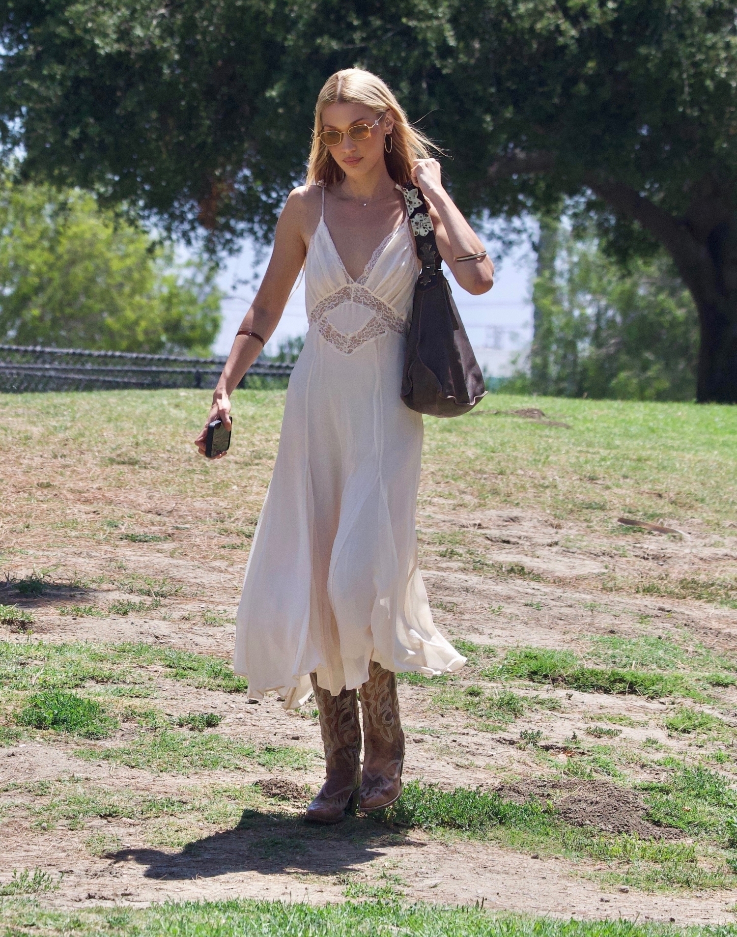 Hadid puki Mango-merkin mekon pitsisillä yksityiskohdilla. Kokonaisuus sai kaivattua särmää cowboy-saappaista ja mokkaisesta olkalaukusta. Hadidin asu on oiva valinta esimerkiksi loppukesän festivaaleille.