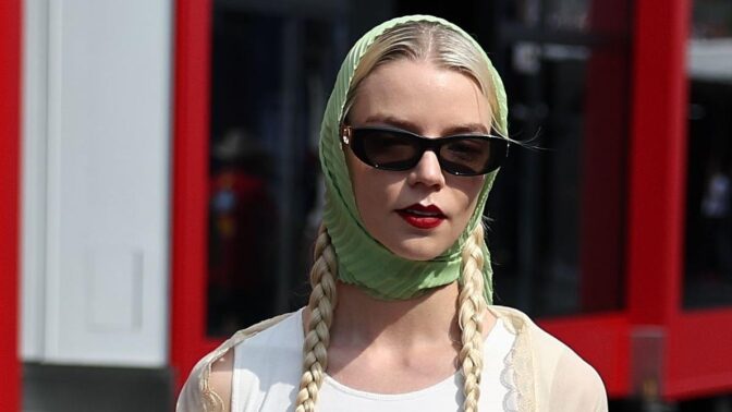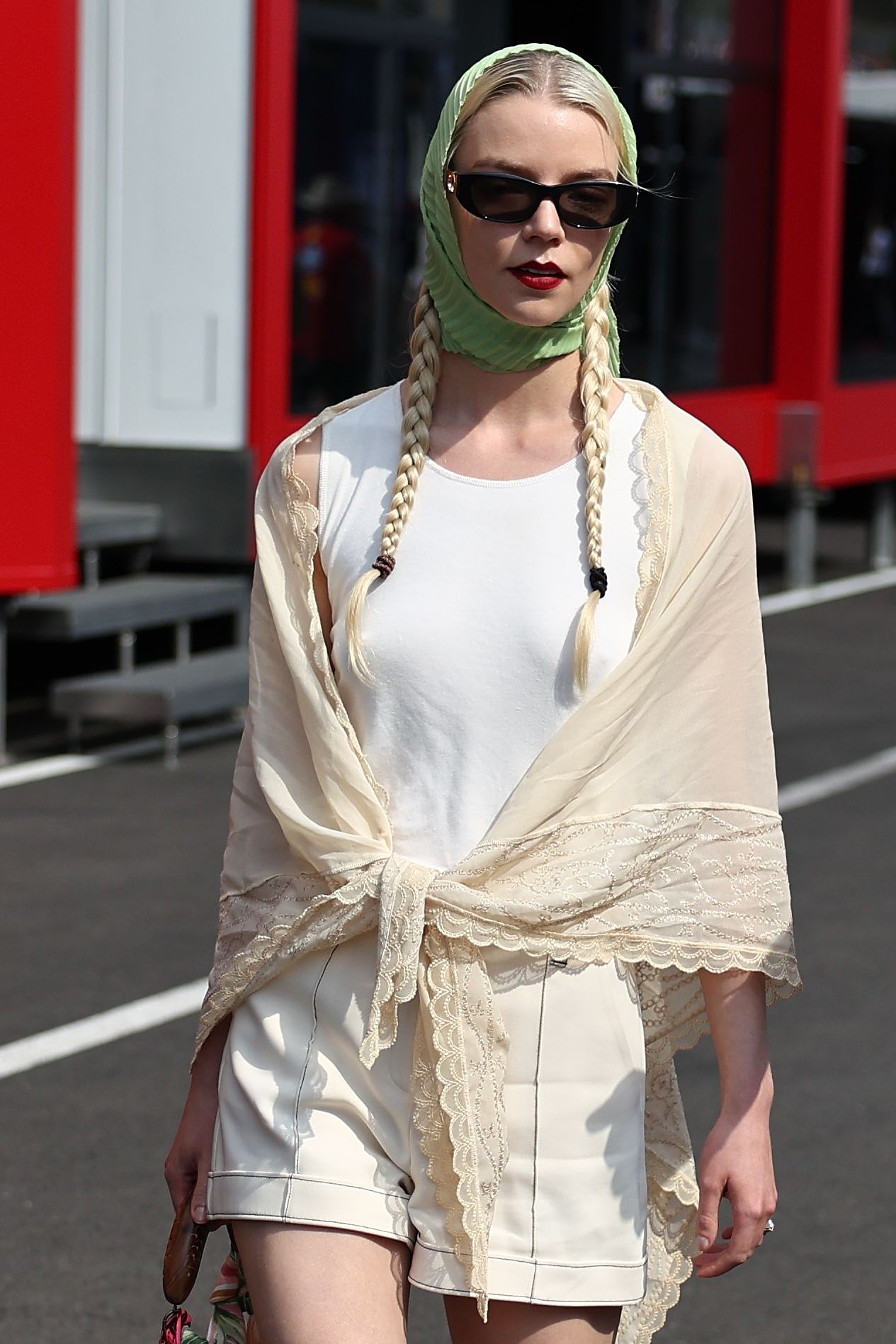 Yksi oiva tapa on ottaa huivi osaksi kampausta. Sitoa poninhäntä huivilla tai verhota se huonona hiuspäivänä pään peitoksi. Tästä lookista oman esimerkkinsä esitteli viikonloppuna Unkarin F1-kisoissa näyttelijä Anya Taylor-Joy, joka toi vaaleaan asuunsa lisäväriä vihreällä huivilla.