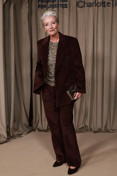 Brittinäyttelijä Emma Thompson saapui palkintotilaisuuteen rusehtavan viininpunaisessa housupuvussa. Pukuun hän oli yhdistänyt myös ruskeaan sävymaailmaan taittavan paidan. Vaikka mikään asun osista ei ole niin sanotusti puhtaasta ruskeasta väripaletista, se sointuu täydellisesti muuhun gaalassa nähtyyn juhlapukeutumiseen.