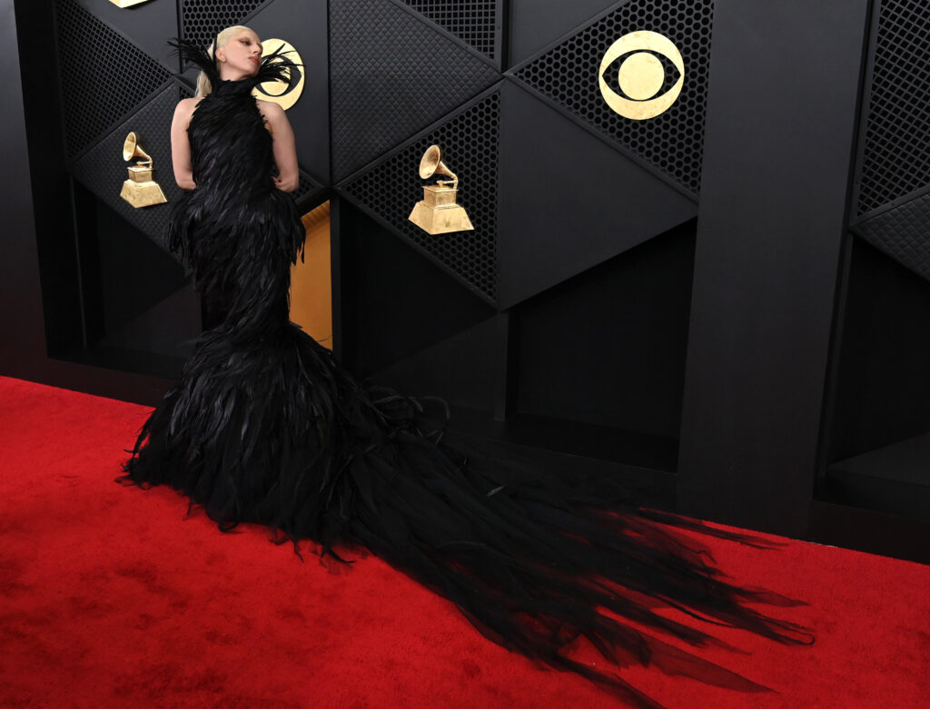 Lady Gagan yllä nähtiin sen sijaan dramaattinen höyheniltapuku, jonka laahus haki vertaistaan.