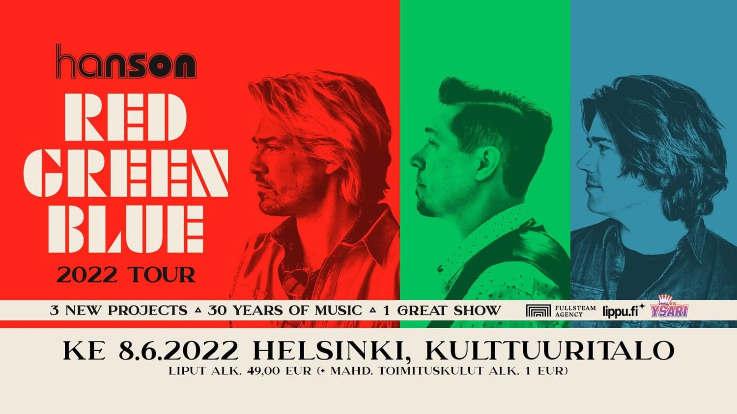 Yhdysvaltalainen pop-rock -yhtye Hanson saapuu ensimmäiselle keikalleen Suomeen toukokuussa ilmestyvän albuminsa RED GREEN BLUE -nimeä kantavan kiertueensa saattelemana.