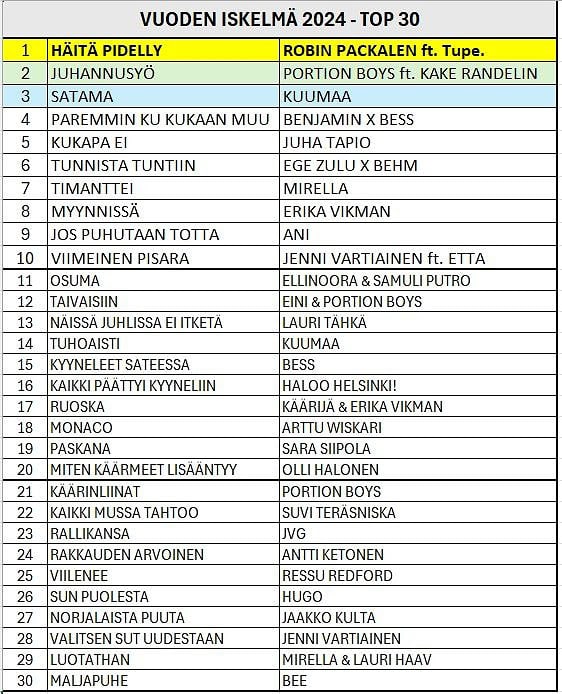 Kaikki top 30 -listalle päässeet artistit ja kappaleet pääset katsomaan alta.