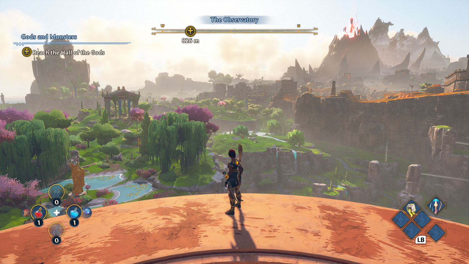 Heti kärkeen Immortals Fenyx Rising tarjoilee pelaajan silmille miellyttävän näköisen ja piirrosmaisen maailman, jonka kaukaisuudessa siintävät vuoret, järvet ja kukkulat suorastaan kutsuvat luokseen tutkimaan ja keräämään niihin piilotettuja esineitä ja aarteita. Tutkimusmatkailu ja salaisuuksien etsiminen osoittautuukin nopeasti todella palkitsevaksi ja mielekkääksi touhuksi, ja Ubisoftin kunnostautuminen avoimen maailman pelien mestarina tulee varsin nopeasti ilmi. Jokaisesta niemestä ja notkelmasta tuntuu löytyvän jotain kilkettä piilotettuna, eikä pieni kiertoreitti varsinaiseen kohteeseen tunnu koskaan turhalta.