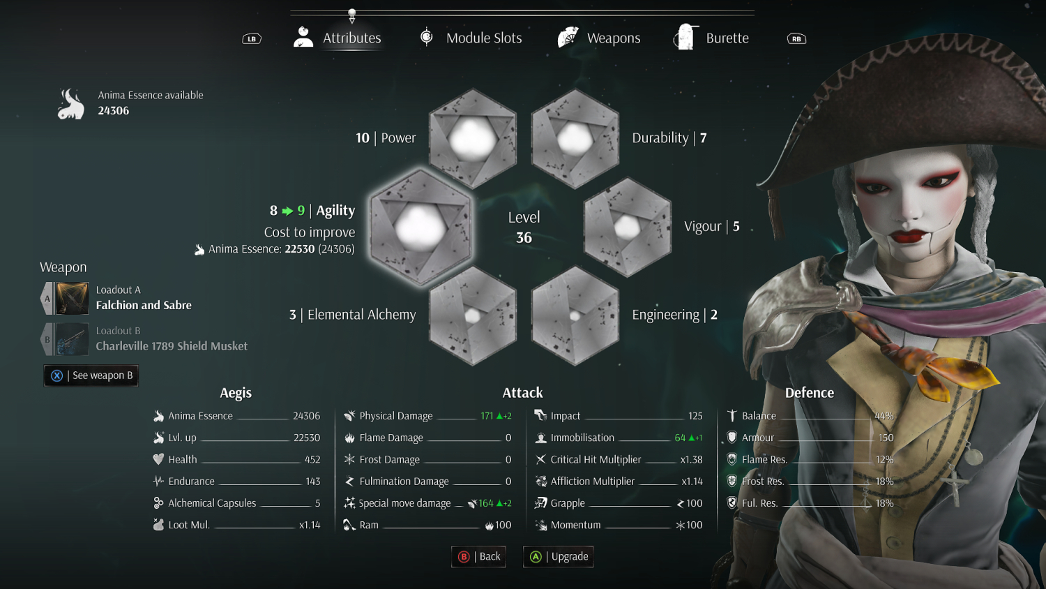 Hahmonkehitys on pelissä varsin perinteisellä lähestymistavalla toimivaa tavaraa. Pelaaja kerää vihollisrobotteja tuhoamalla sielunrippeitä, joita sitten käytetään statsien päivittämiseen. Tämän lisäksi isommilta vihollisilta putoaa, ja pelimaailmaan ripotelluista arkuista löytyy, avaimia, joita käyttämällä avataan ja päivitetään moduulislotteja, joihin sitten ripotellaan pelitavan mukaisesti parhaiten toimivia moduuleita. Eli siis charmeja. Tai sormuksia. Mitään kovin mullistavaa tämä kehitysmuoto ei tarjoa, mutta jos pyörä toimii, niin ei sitä toisaalta kannata uudelleenkaan keksiä.