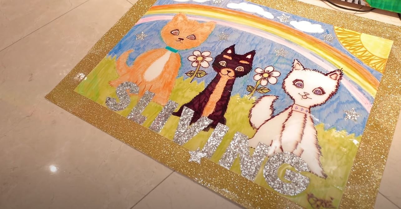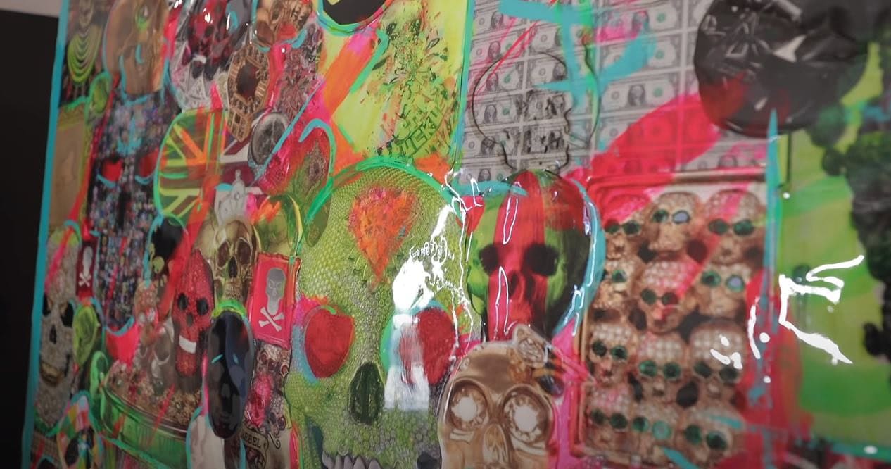 Videolta käy nopeasti ilmi naisen taideteosten kulmakivet: kissat, sateenkaaret ja värikkäät kollaasit. Nainen on leikellyt kollaaseja muun muassa pääkallojen kuvista ja omista kuvistaan.