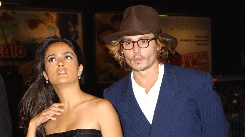 Ensimmäisessä kuvassa Hayek ja Depp ovat juhlatunnelmissa ja toisessa poseeraavat Once Upon a Time in Mexico -elokuvan julisteessa.