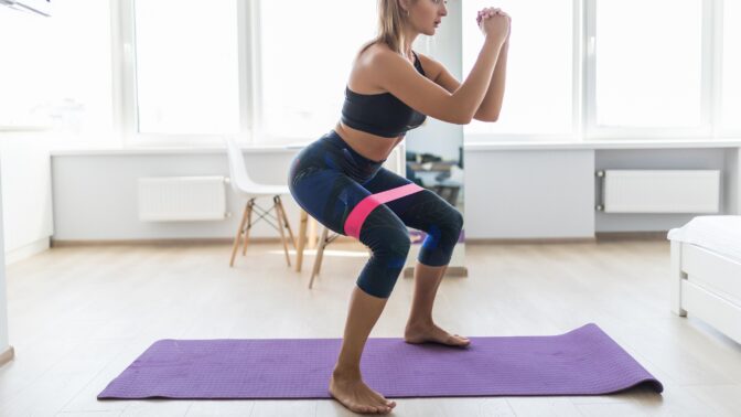Liikkeet ovat varmasti suurelle osalle tuttuja. Mukana on niin perinteistä kyykkyä kuin sivukosketuksiakin. Tässä treenissä teho kuitenkin perustuu kuminauhaan, joka antaa lisävastusta ja saa aikaan suurta polttelua.