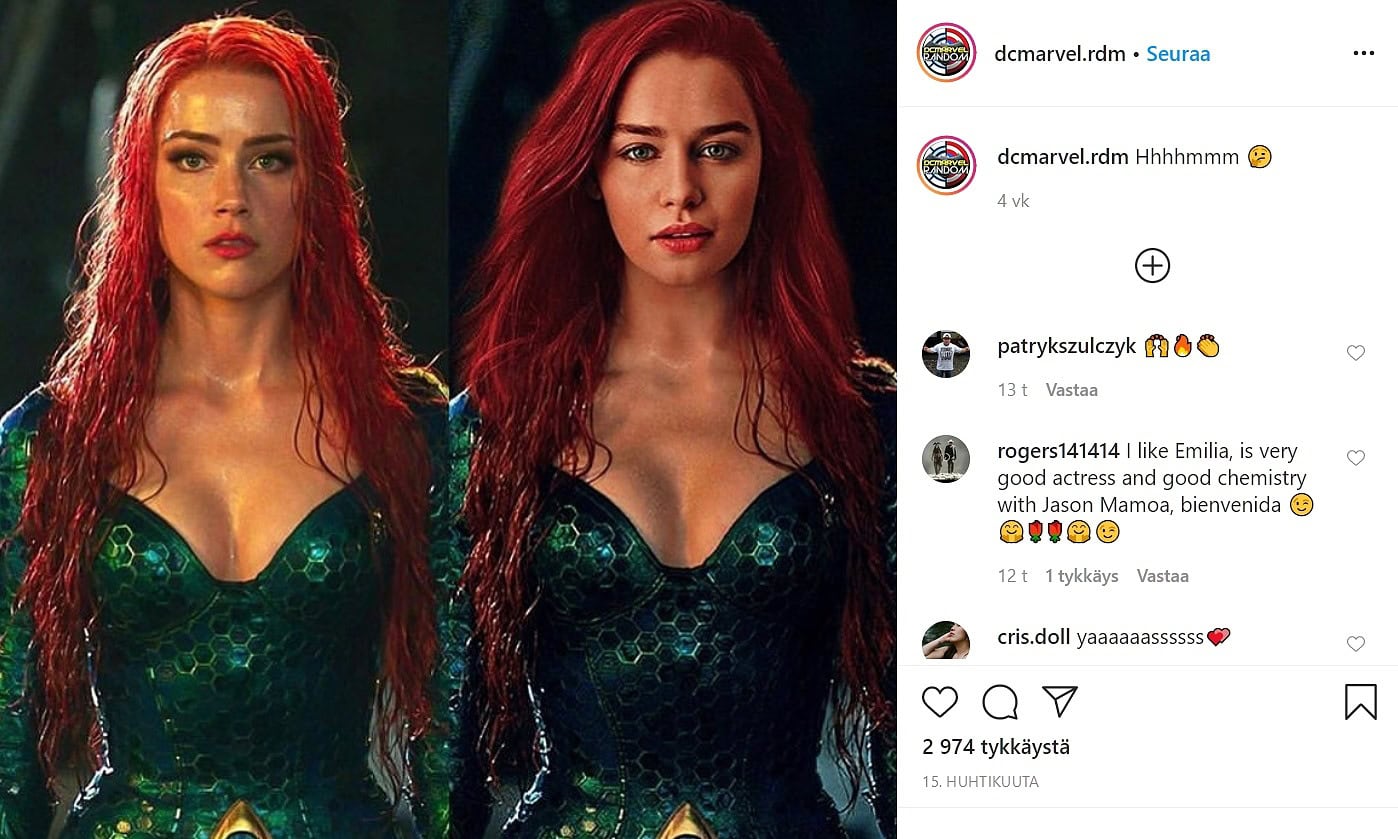 Nyt somessa on levinnyt erään fanin näkemys siitä, kuka voisi korvata Heardin. Fani oli nimittäin korvannut Heardin Game Of Thrones -tähti Emilia Clarkella ja valloittava lopputulos on hurmannut satoja.