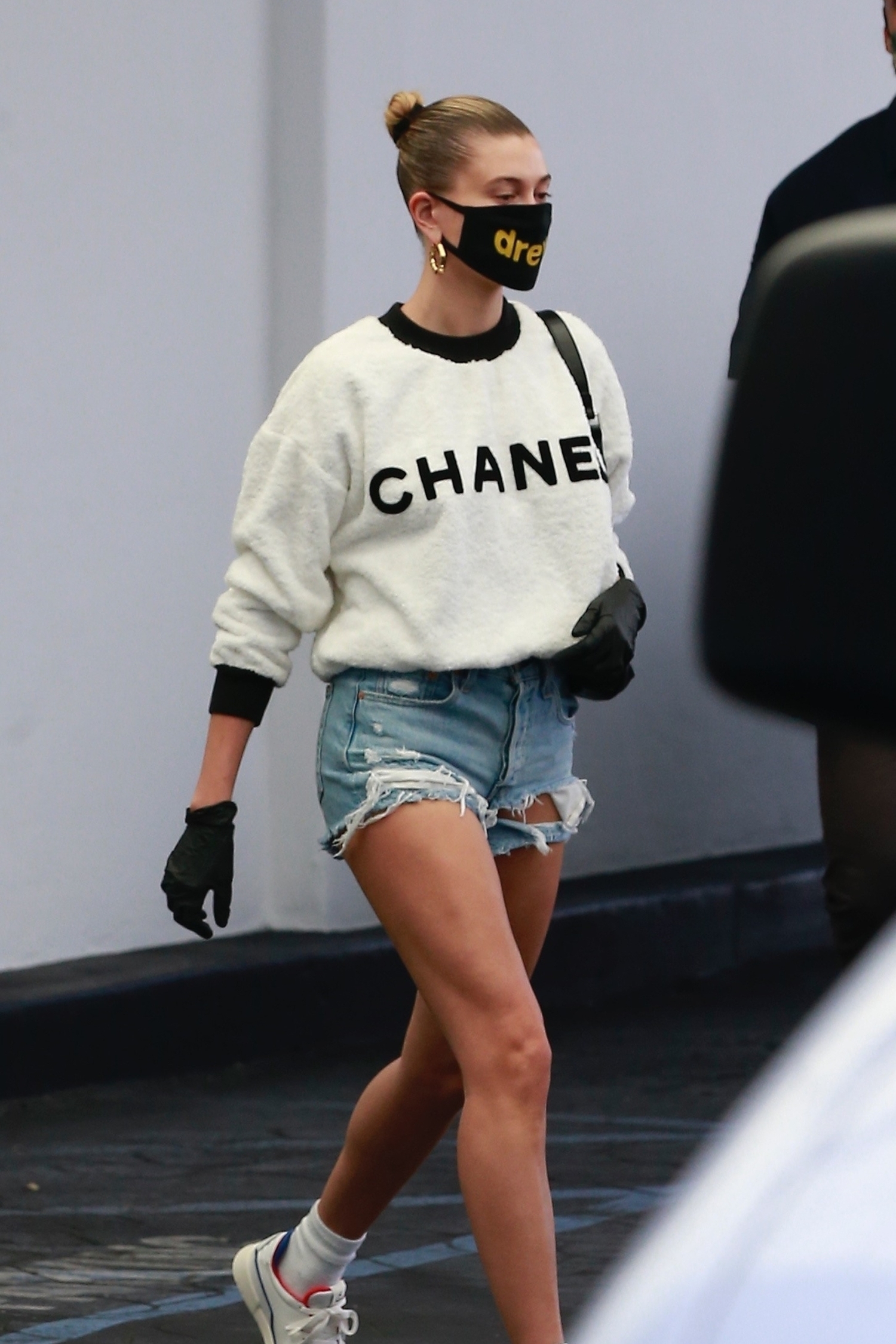 Vaikka moni yhdistääkin farkkushortsit t-paitaan tai toppiin, toimivat ne järjettömän hyvin myös huppareiden ja neuleiden kanssa. Sen tietää myös Hailey Bieber, joka bongattiin kopioimisen arvoisessa lookissa kaupungilta.
