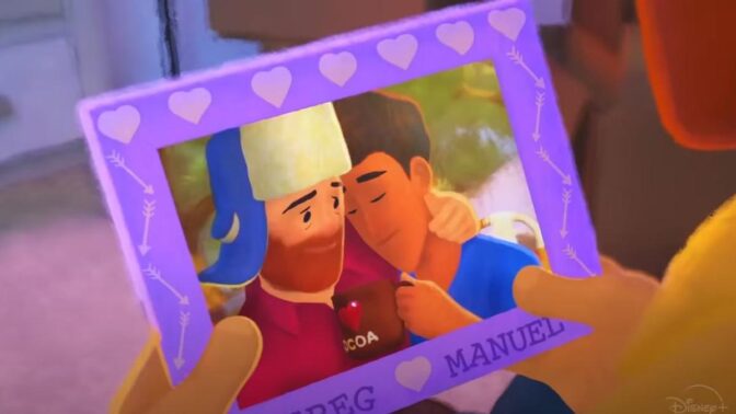 Lapsille suunnatut animaatiot ovat pitäneet sisällään varsin vähän homoseksuaaleja hahmoja, saati sitten päähenkilöitä. Tuore Pixar-studion lyhytelokuva tekee tässä poikkeuksen. Out-niminen animaatio on Pixarin ensimmäinen, jossa on homoseksuaali päähenkilö. Animaatiossa nähdään myös kahden miehen välinen suudelma ensimmäistä kertaa missään Pixar-tuotoksessa.