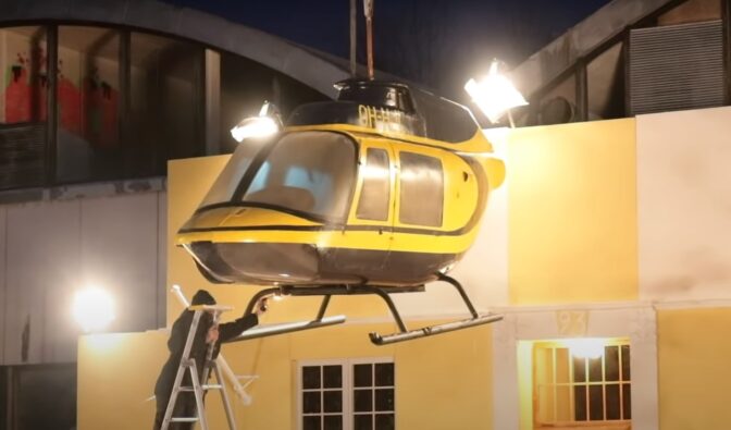 – Kohtaukset, joissa helikopteri tippuu auton päälle, kuvattiin kaikki Huvilakadulla. Sinne itse helikopteria ei kuitenkaan saatu tuotua, joten paikasta otettiin kuva ja myöhemmin rakennettiin lavasteseinä, joka oli täsmälleen samanlainen, Mäkinen kertoo.