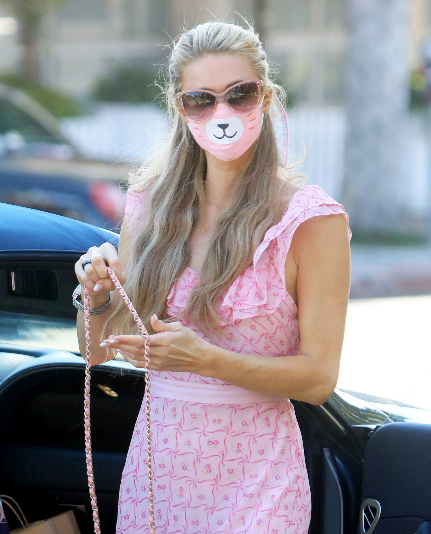 Tällä kertaa Hilton oltiin kuvattu shoppailemassa Los Angelesissa, missä hän käveli kadulla kauniissa pinkissä kesämekossa. Hilton oli myös suojautunut asuun sopivalla kasvosuojalla, joka esitti kissan naamaa.