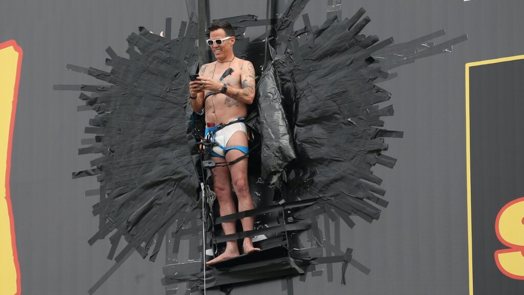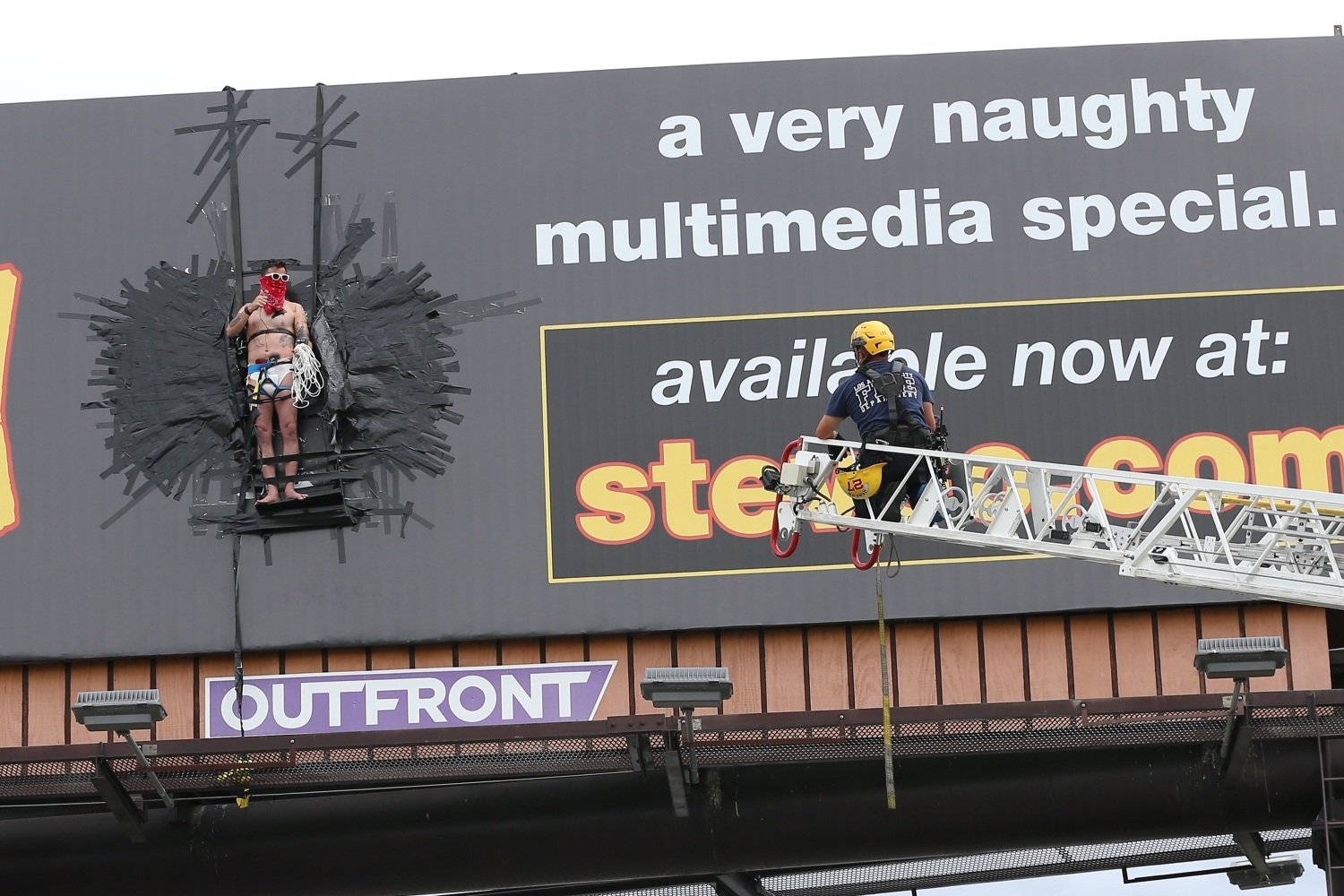 Mainoskyltti oli vilkkaan tien yläpuolella, ja Jackass-tähti oli kiinnitetty siihen reilulla määrällä mustaa teippiä. Tempaus loppui kuitenkin lyhyeen, kun palokunta saapui paikalle.