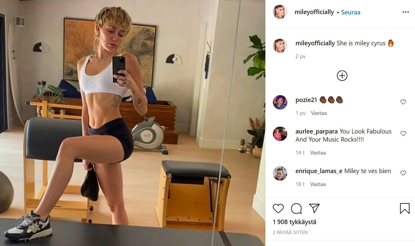 Cyrus on muun muassa hurahtanut eron jälkeen kunnolla liikuntaan ja treenannut Hollywood Life -julkaisun mukaan paljon kuntosalilla. Cyrus olikin esitellyt timmiä vartaloaan Instagram-tarinoissaan ja kyseinen kuva levisi myös Cyrusin fanisivustoille.