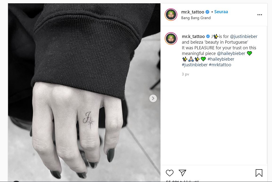 Kerroimme aiemmin tällä viikolla, kuinka Justin Bieberin, 26, vaimo, Hailey, 23, korvasi vihkisormuksensa tatuoinnilla. Bieberin nimetöntä koristaa siis tällä hetkellä J-kirjain, joka on tietenkin kunnianosoitus hänen rakkaalle aviomiehelleen.