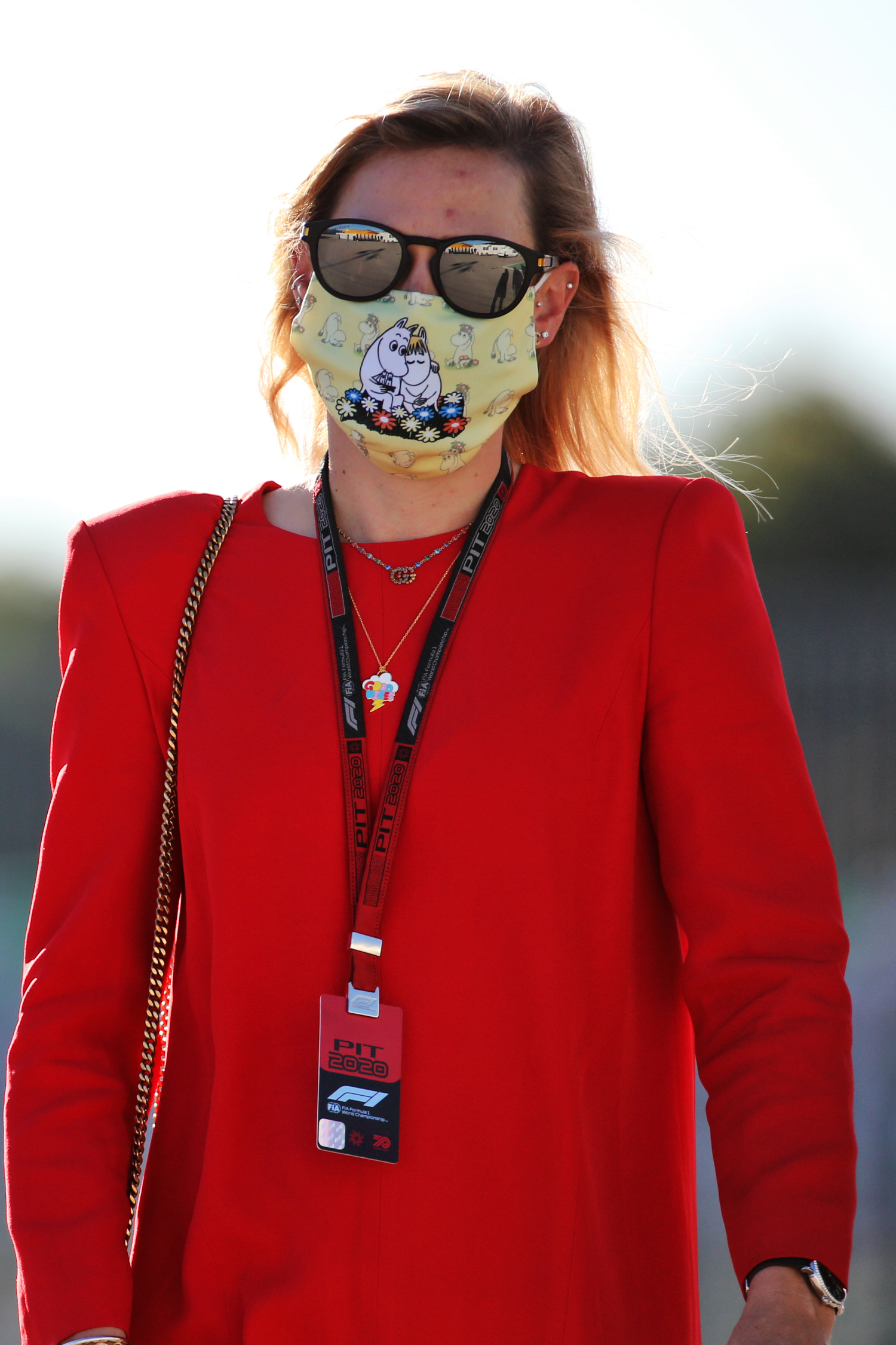 Varikolla rakastaan kannustamassa nähtiin myös Bottaksen tyttöystävä Tiffany Cromwell, 32, joka oli ajankuvamukaisesti sonnustautunut kasvomaskeihin. Huomiota herättävää sen sijaan oli kuosi, joka Cromwellin maskeissa nähtiin.