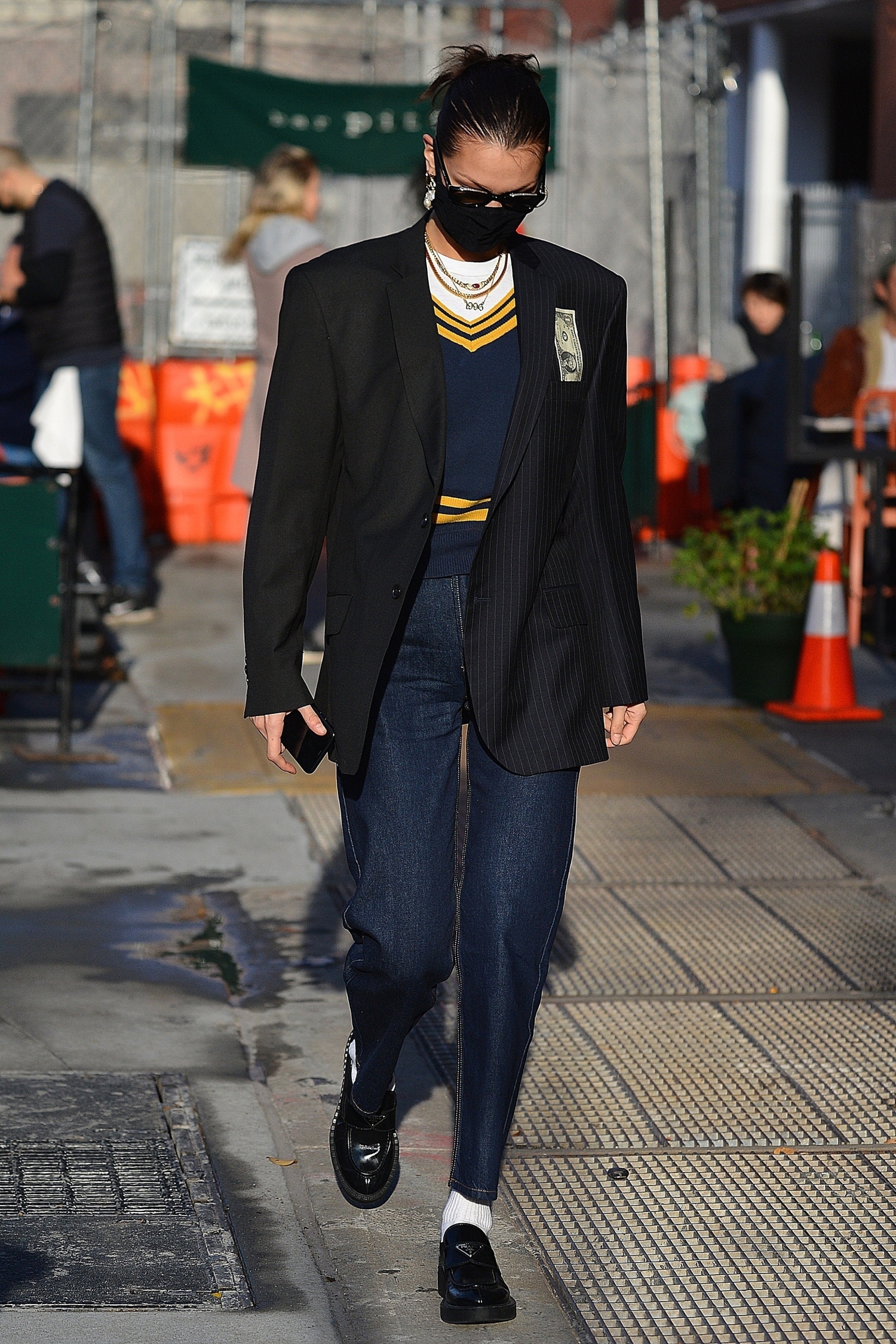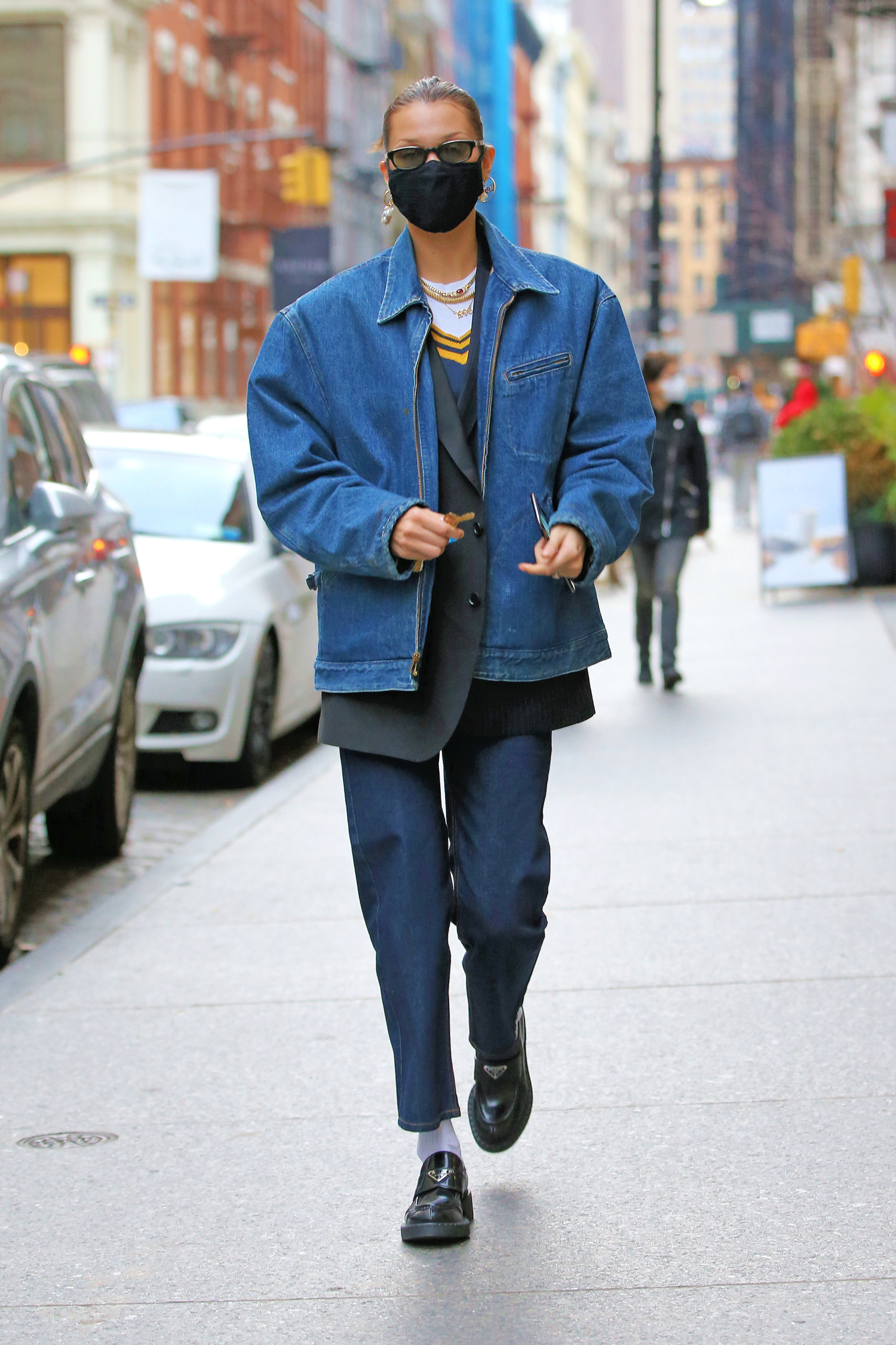 Edellistä asua voi myös muunnella helposti, kuten Hadid todistaa. Jakku on vaihtunut väljempään harmaaseen malliin ja sen päälle Hadid on kiskaissut vielä ylisuuren farkkutakin. Lämmin ja trendikäs asu on täydellinen kaupungille.
