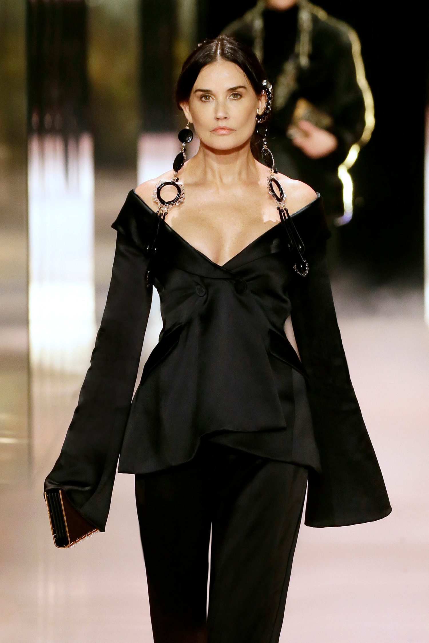 Demi Moore, 58, nousi catwalkille Pariisin muotiviikoilla Fendin muotinäytöksessä. Naisen yllä nähtiin musta upea asukokonaisuus sekä näyttävät korvakorut, jotka olivatkin varmasti yksi kyseisen asun katseenkääntäjistä.