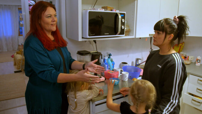 – Lapselle riittää vahvaa vuorovaikutusta 15-20 minuuttia muutaman kerran päivässä. Ja nyt meidän pitää harjoitella sitä, että asetut olemaan lasten kanssa ja lähellä heitä, Penttala ohjeistaa äitiä illan jaksossa.