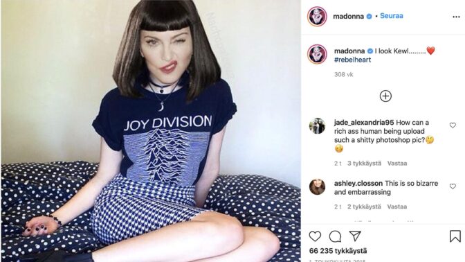 Kohutussa kuvassa, joka on vielä nähtävissä Madonnan Instagram-tilillä, laulaja istuu sohvalla Joy Division -bändipaita päällään ja katsoo kameraan. Hänen päänsä vaikuttaa olevan hieman liian suurikokoinen muuhun kehoon verrattuna, josta laulaja vitsaili kuvatekstissä.