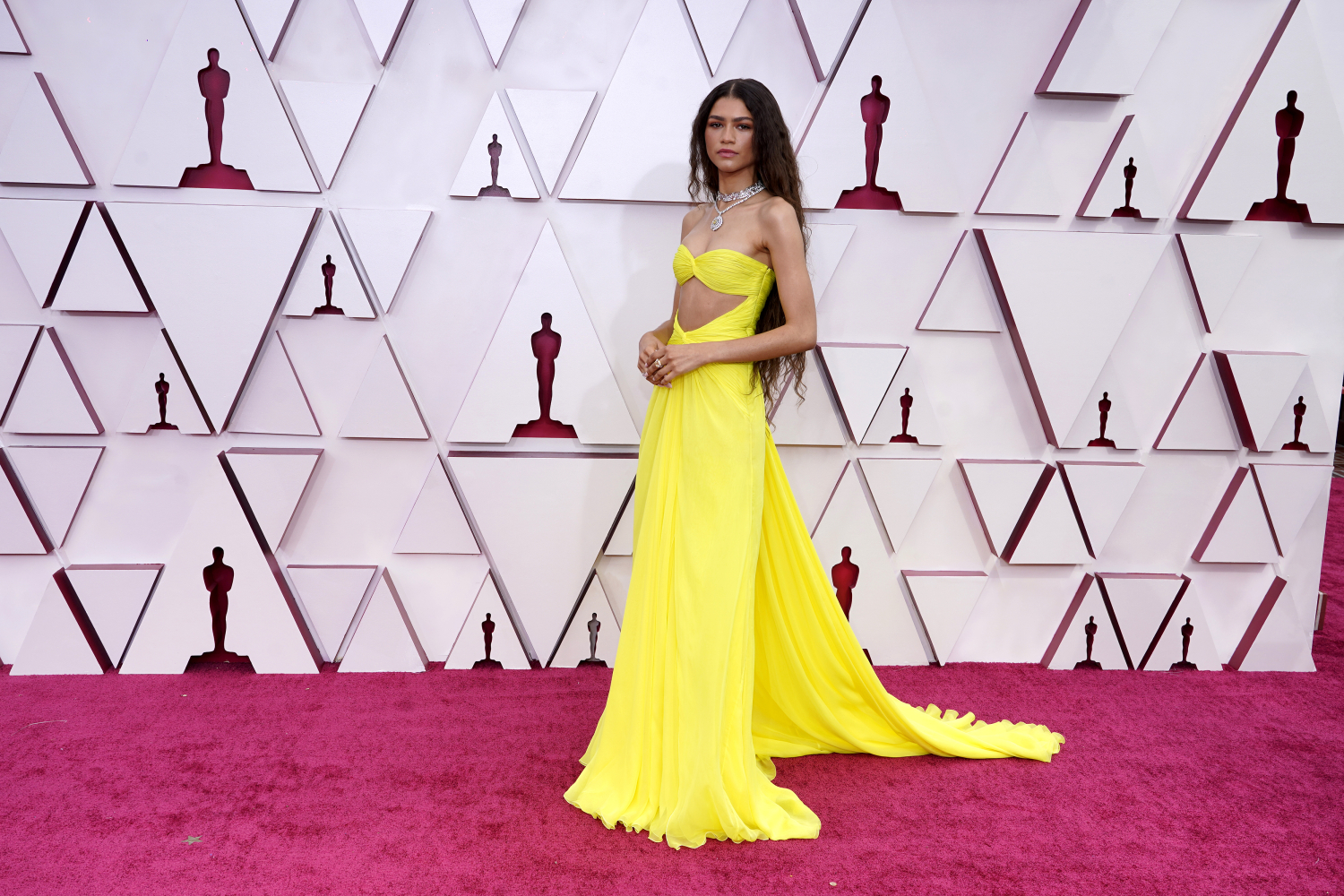 Zendayan yllä nähtiin neonkeltainen Valentinon iltapuku, jonka etuosassa oli pieni cut out -yksityiskohta. Pitkät hiukset oli jätetty auki ja kaulaa koristi näyttävä koru, joka Voguen mukaan on arvoltaan lähes 5 miljoonaa euroa.