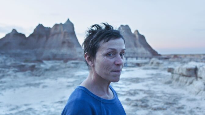 Nomadland kertoo työnsä menettäneestä Fernistä (McDormand), joka pakkaa omaisuutensa pakettiautoon ja lähtee elämään nykypäivän nomadina yhteiskunnan ulkopuolelle. Jo ennen Oscar-gaalaa elokuva oli saanut merkittäviä tunnustuksia. Se voitti Venetsian elokuvajuhlilla pääpalkinnon Kultaisen leijonan, ja se sai myös kaksi Golden Globe -palkintoa.