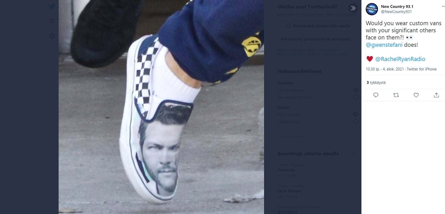 Kuukausi sitten naimisiin mennyt laulaja Gwen Stefani, 51, on ihastuttanut tuoreella kenkävalinnallaan. Somessa on ymmärrettävästi innostuttu, sillä Stefani on mitä ilmeisimmin teettänyt kustomoidut Vans-kengät oman rakkaansa Blake Sheltonin kasvoilla.