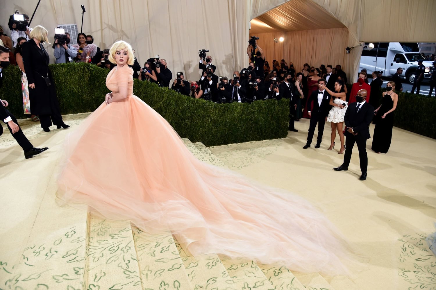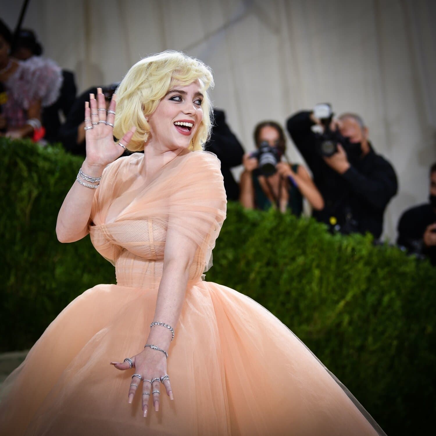 Eilish saapui tilaisuuteen klassista Hollywood-kauneutta hehkuen. Naisella oli yllään persikanvärinen Oscar de la Rentan mekko, jonka valtava laahus vaati useamman kantajan.