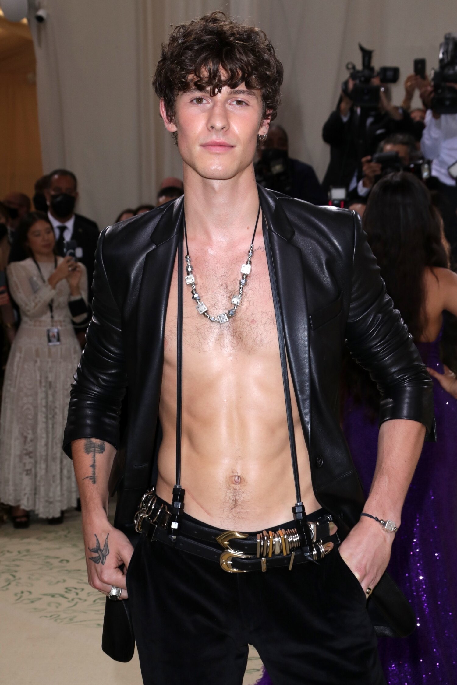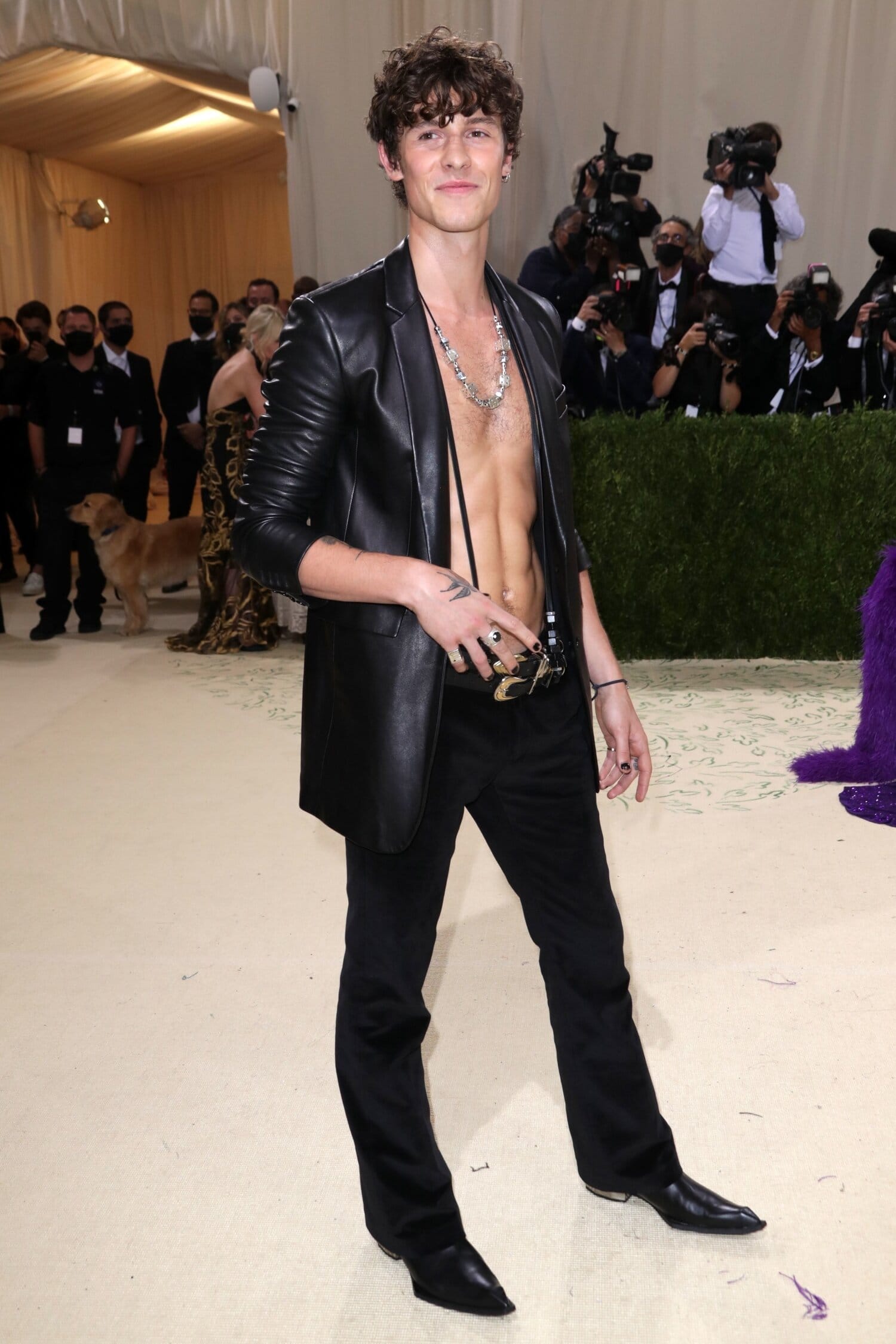 Shawn Mendes, 23, saapui eilen järjestettyyn Met-galaan asussa, joka rikkoi perinteistä pukukaavaa. Miehen yllä nähtiin musta nahkajakku sekä mustat samettihousut, molemmat Michael Korsin mallistosta. Niiden pariksi hän oli valinnut cowboy-bootsit sekä kaksi näyttävää vyötä. Paidan mies sen sijaan oli jättänyt kotiin.