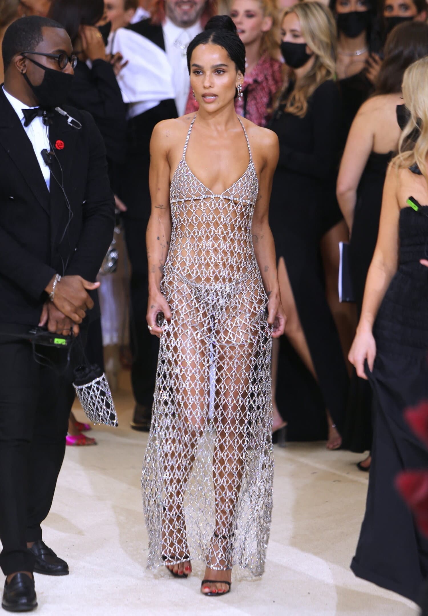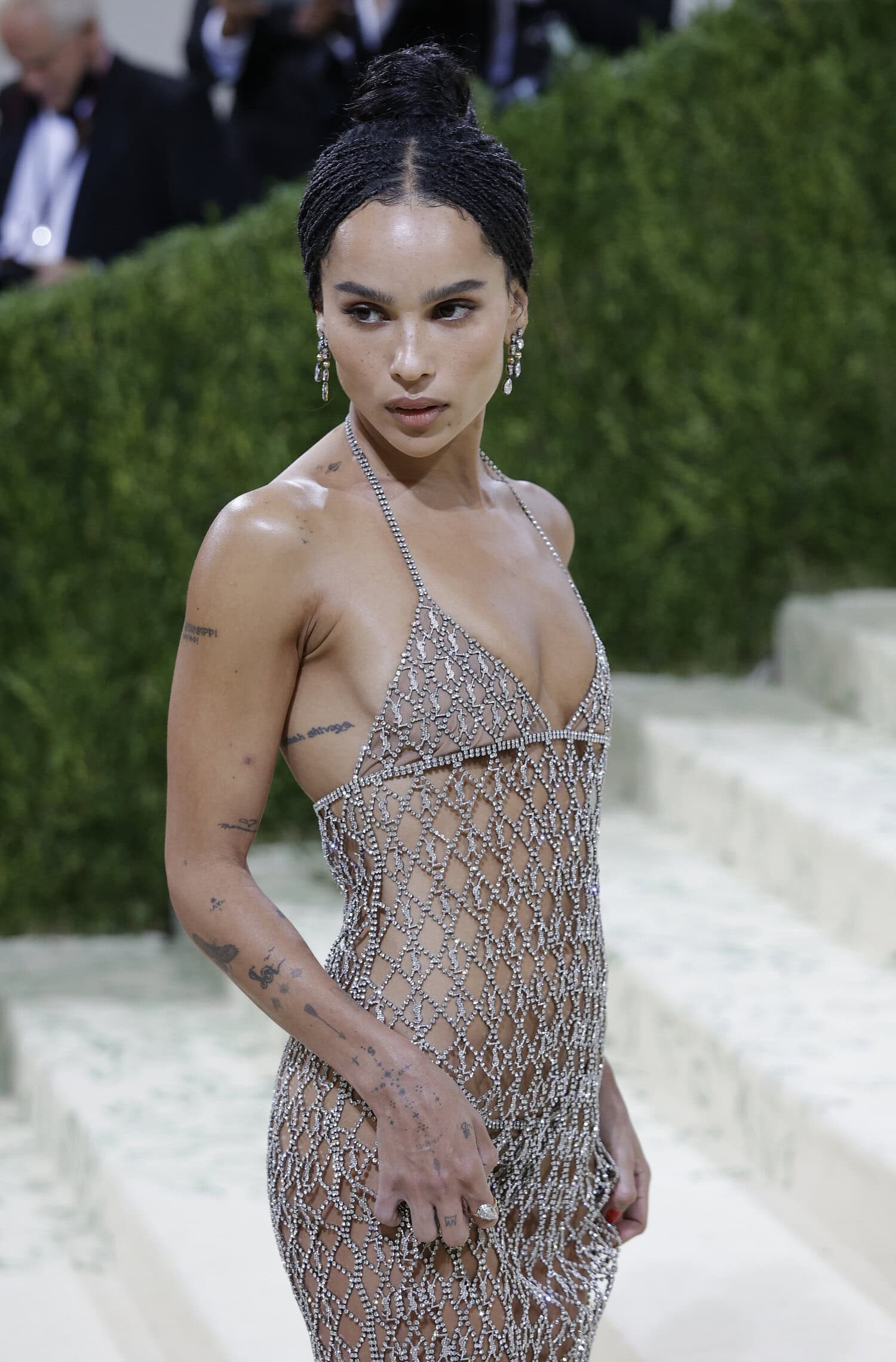Näyttelijä-malli Zoë Kravitz, 32, oli saapunut 13. syyskuuta järjestettyyn Met-gaalaan läpinäkyvässä Saint Laurentin nakumekossa.